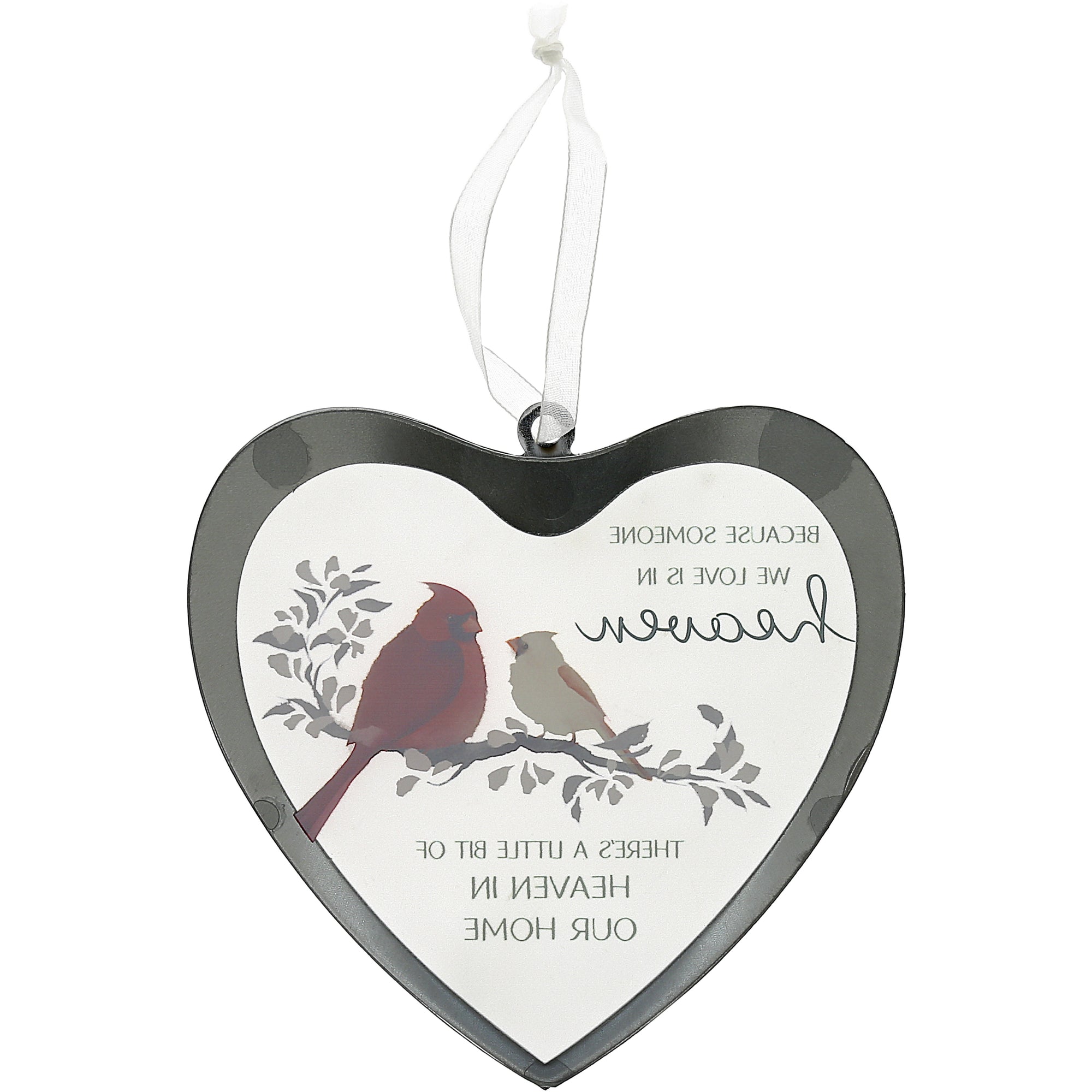 - IN-HOUSE DESIGN: Two exquisite red cardinals find repose upon a delicate cherry blossom branch, while the poignant sentiment "Because Someone We Love Is In Heaven, There's A Little Bit Of Heaven In Our Home" adorns the centerpiece of the ornament.