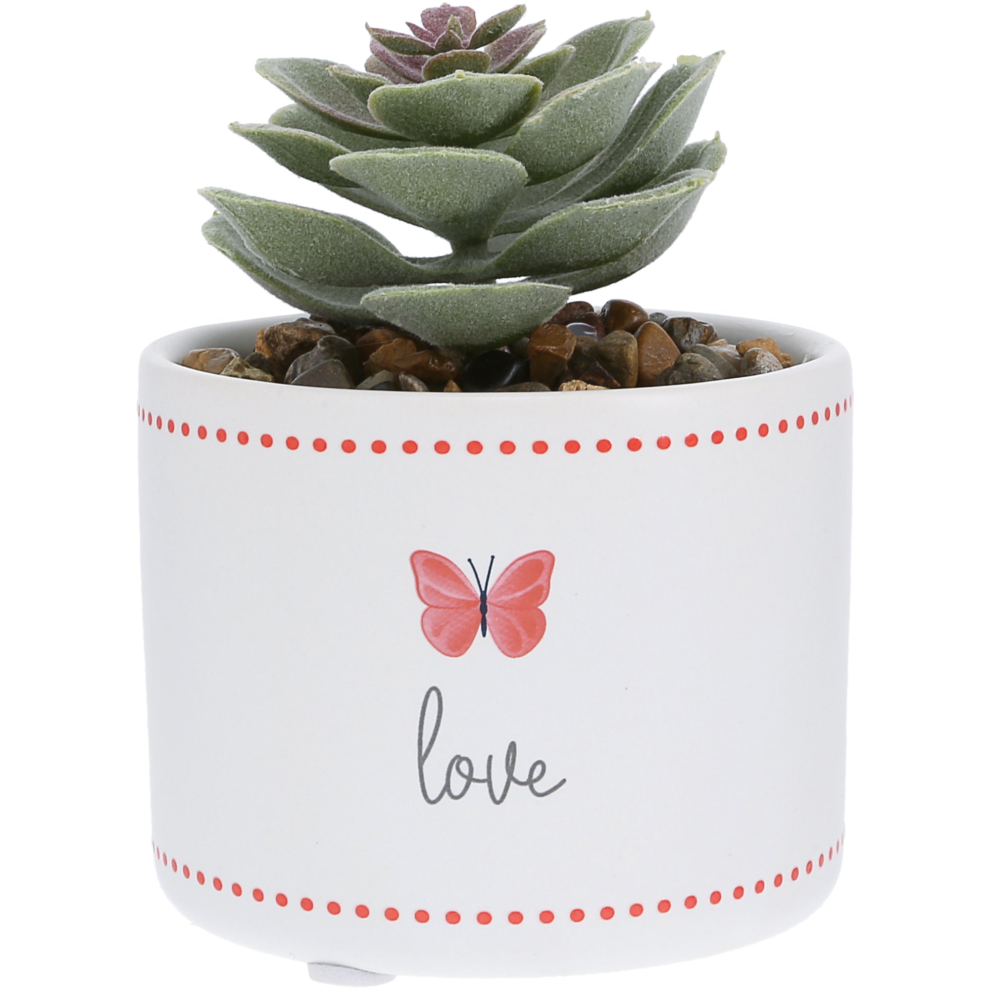 - IN-HOUSE DESIGN: The light gray cursive wording "love" is in the center of the artificial plant accompanied by a pink butterfly and pink polka dot pattern wrapping around the top and bottom of the vessel. It is great for decorating your home's living room, den, office, or bedroom on a desk, shelf, or table. You can even bring this cute little planter to the office for a fun and colorful touch to your desk decor.