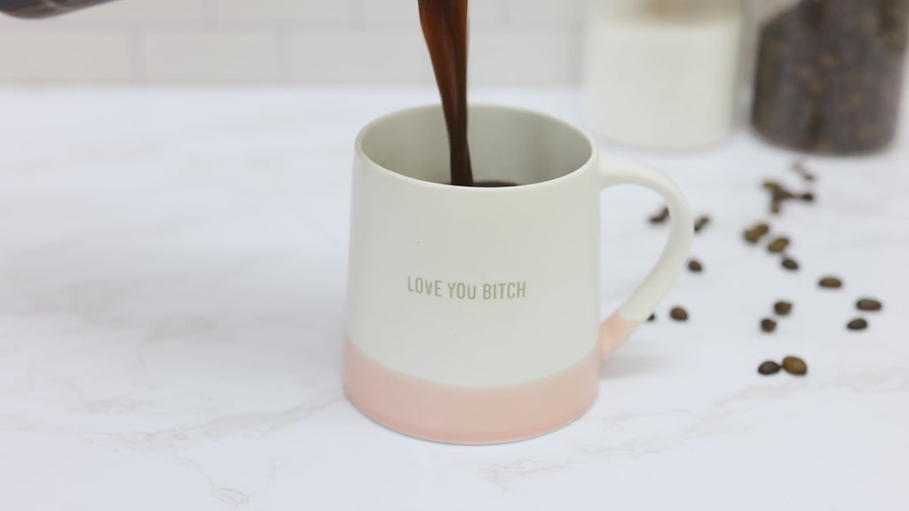 - IN-HOUSE DESIGN: The hand-dipped 1/3 pink-colored bottom is unique to each piece. The tan debossed "Love You Bitch" sentiment is stamped in the middle center of the white upper half of the front side of the cup. This simplistic, modern-styled mug is the perfect addition to any drinkware collection.