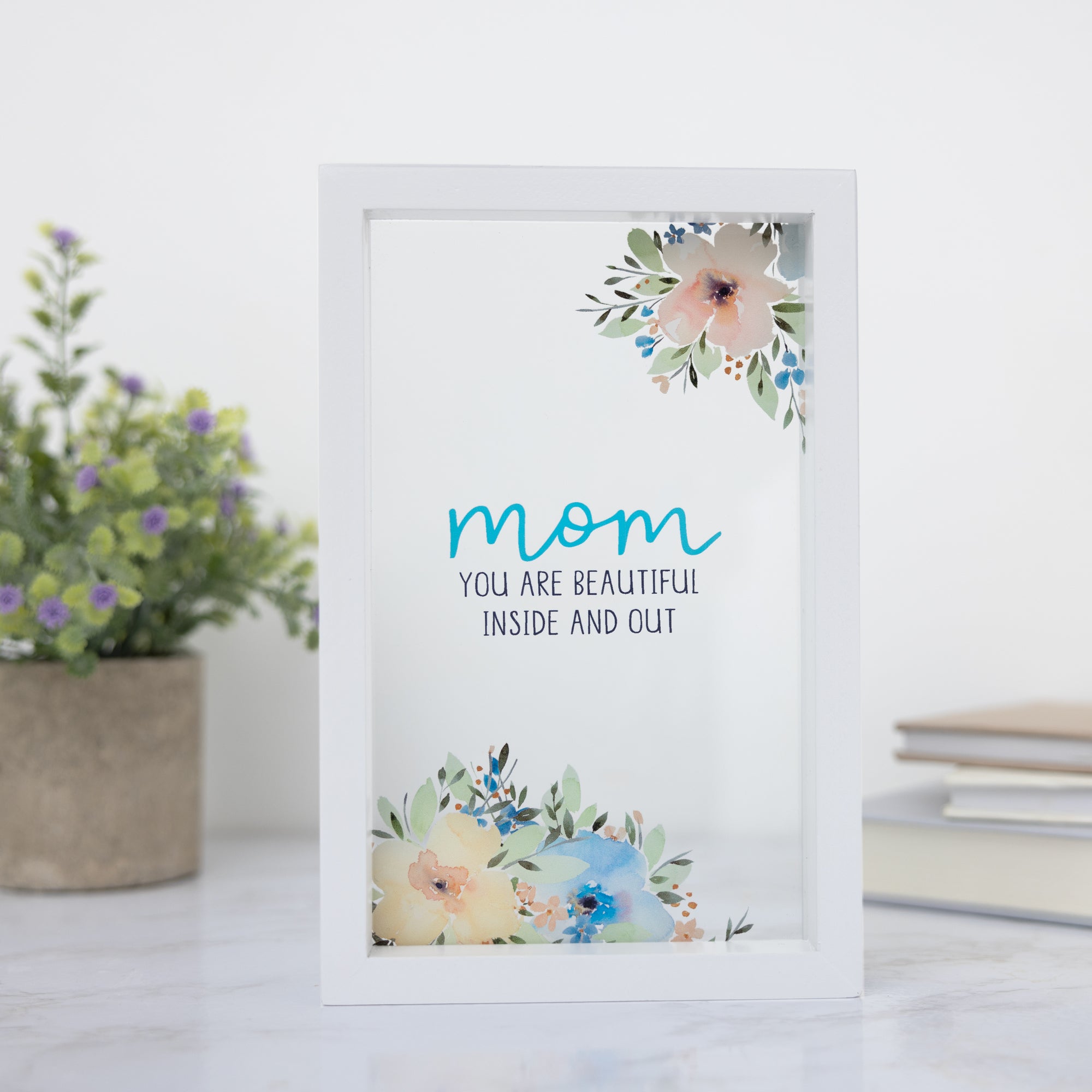 - IN-HOUSE DESIGN: Green, yellow, blue, and orange watercolor paint-inspired flowers accompany a "Mom: You Are Beautiful Inside And Out" sentiment-printed decal on the front side of the see-through glass. The artwork was designed by Blue Chair Blessing, who sees beauty in everyday life.