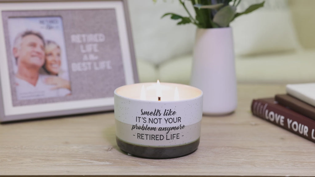 - IN-HOUSE DESIGN: The new & innovative candle offers a unique message for your loved one within the wax as time progresses. You will see the star and "Retired" star and circular logo sentiment after about 10 minutes. As you watch, the entire decal will appear after 60 minutes. Then, the message will hide again and reappear with each burn. The front of the candles has a simplistic "Smells Like It's Not Your Problem Anymore - Retired Life -" decal accompanied by a tri-colored brown, tan, and white matte speckled exterior and glossy tan interior.