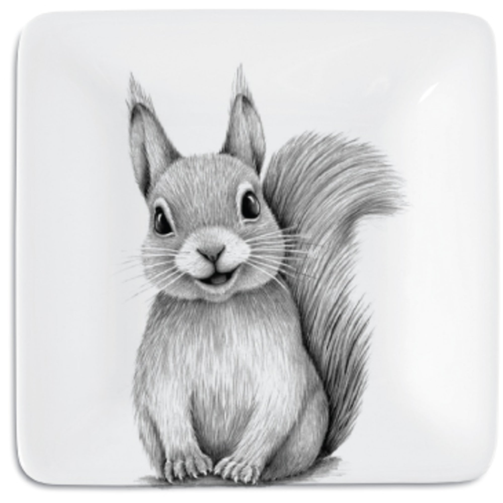 - IN-HOUSE DESIGN: Features a hand-drawn-style illustration of a bright-eyed squirrel perched upright with a fluffy tail curled over its back. Rendered in detailed pencil sketch tones, the artwork adds rustic woodland charm and playful personality to the dish’s clean white base.