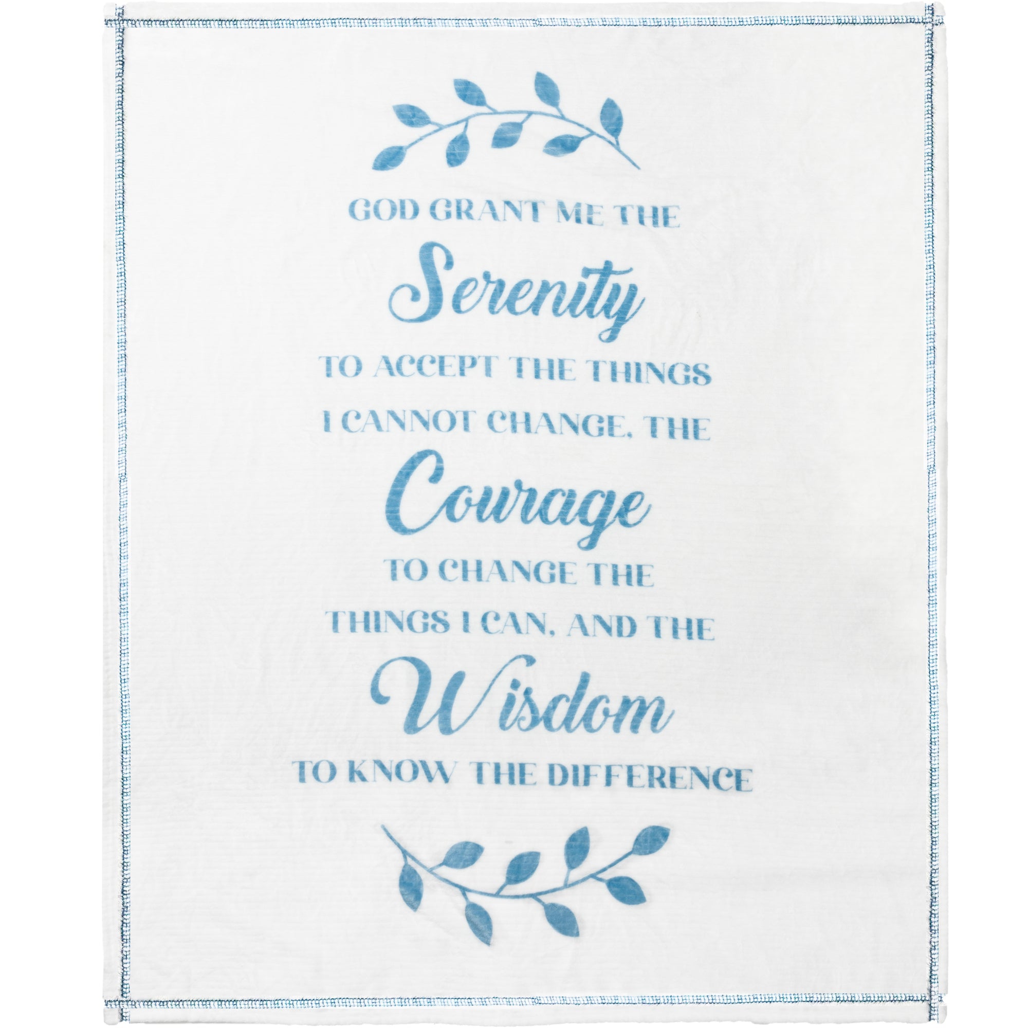 - IN-HOUSE DESIGN: Features the beloved Serenity Prayer printed in calming blue lettering surrounded by gentle botanical accents. The crisp white fabric paired with soft blue tones creates a peaceful, soothing aesthetic. Printed artwork appears centered and clear without stiffness, ensuring the blanket remains soft, flexible, and inviting.