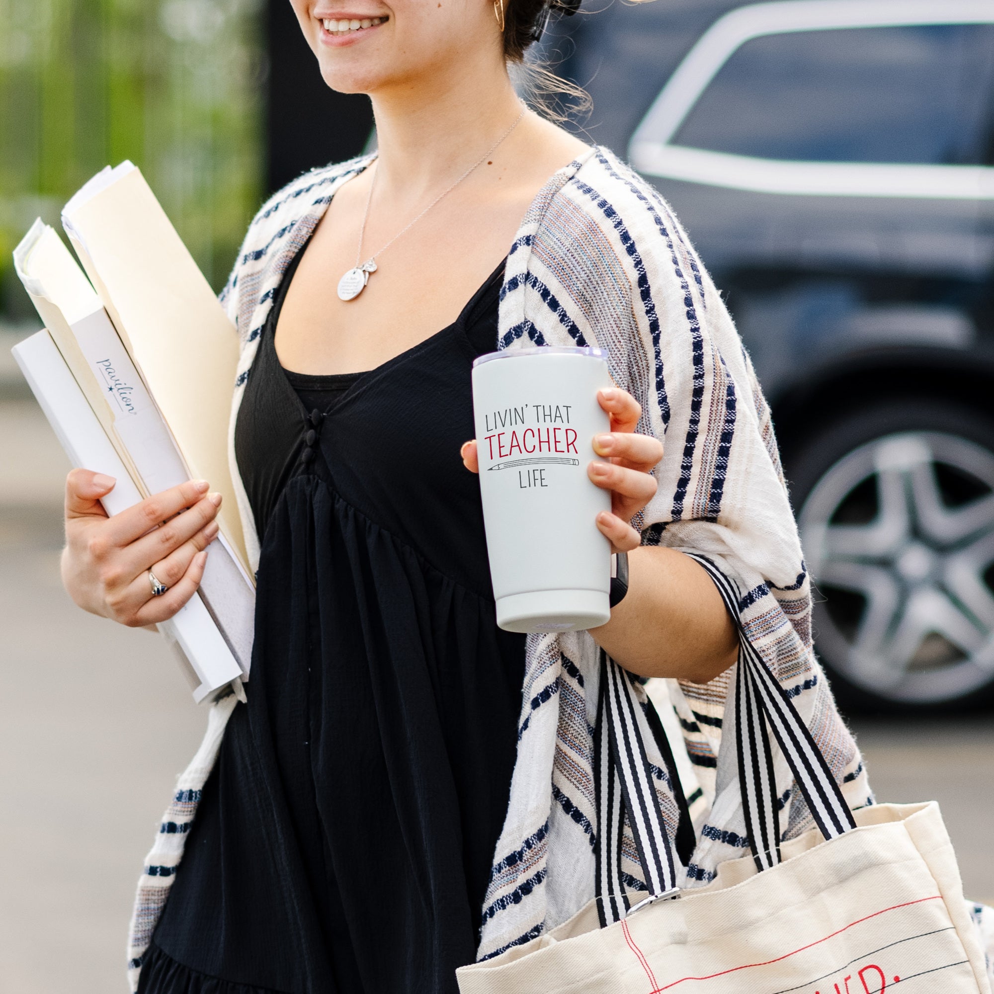 - IN-HOUSE DESIGN: The front side of the white coffee, tea, the hot cocoa tumbler has a black pencil decal accompanied by a "Livin' That Teacher Life" sentiment.