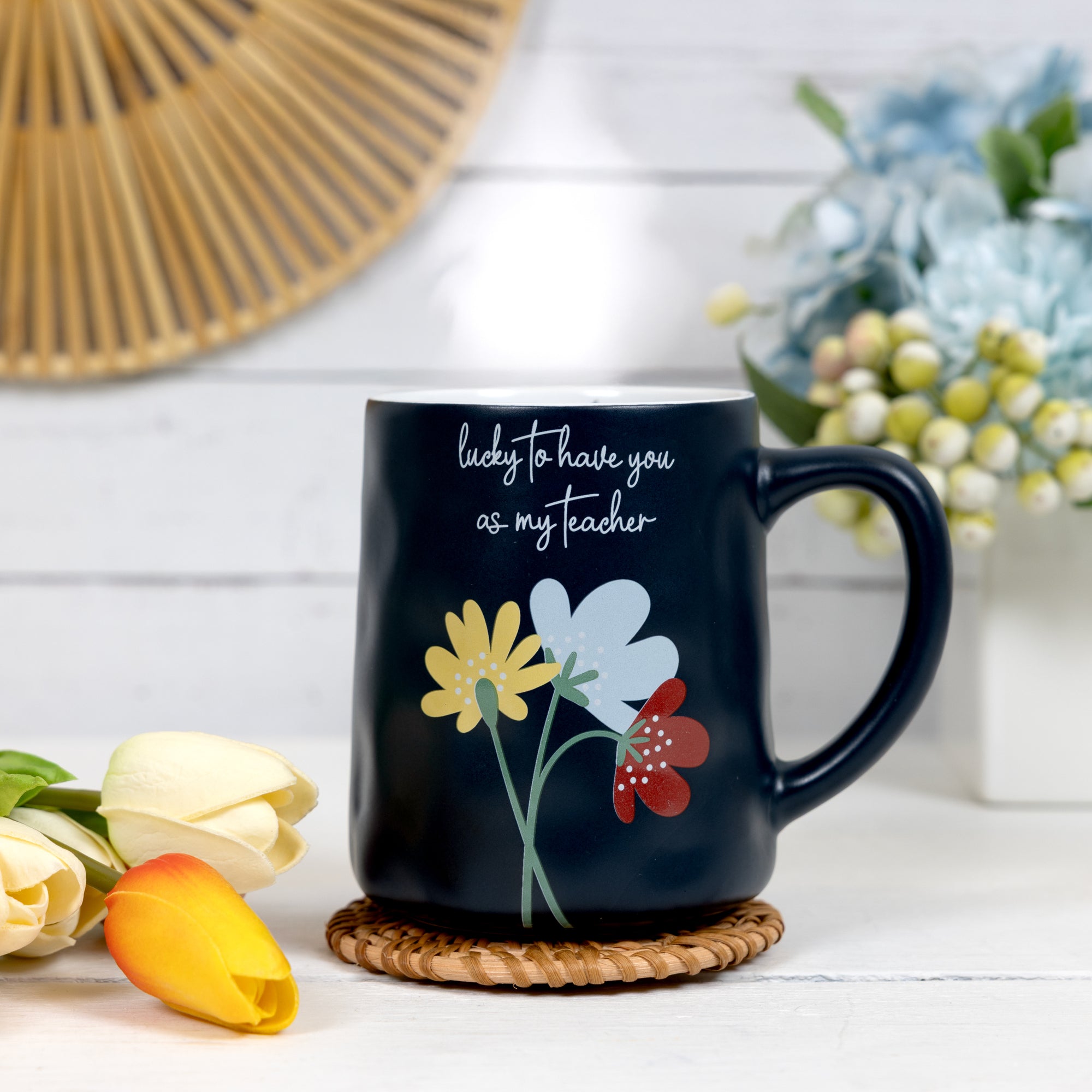 - IN-HOUSE DESIGN: Features a navy background adorned with colorful floral illustrations and the handwritten sentiment “lucky to have you as my teacher.” The interior rim includes a tiny ladybug decal—a playful hidden detail that makes each use feel special. Bright, uplifting, and garden-inspired, the design pairs modern floral artwork with heartfelt gratitude.