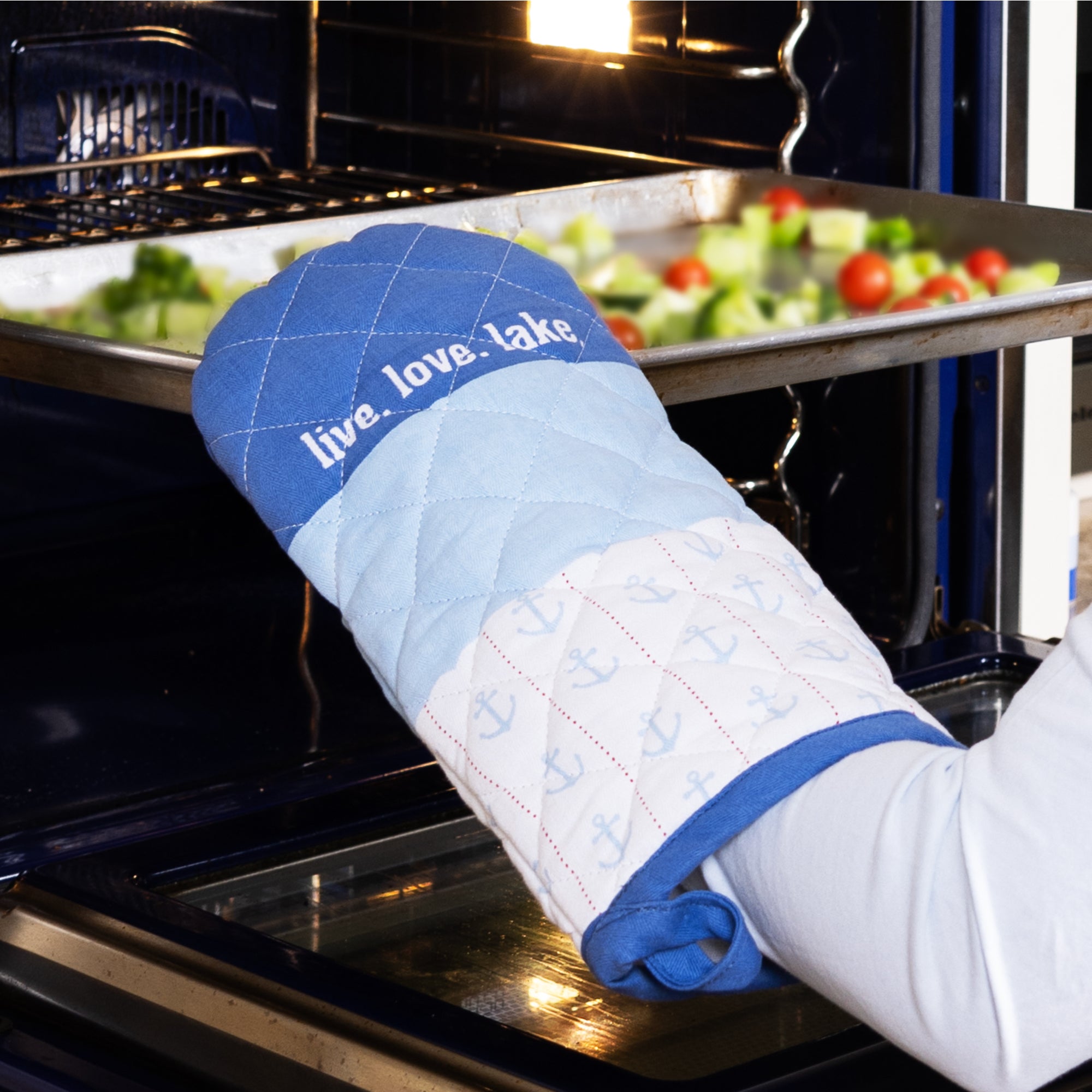 - IN-HOUSE DESIGN: The oven mitt boasts a soothing blue palette, with the phrase "live. love. lake" elegantly printed on the top in white. The pattern features anchors, evoking the serene vibes of lake life, and is printed on both sides of the mitt, creating a visually appealing and consistent design.