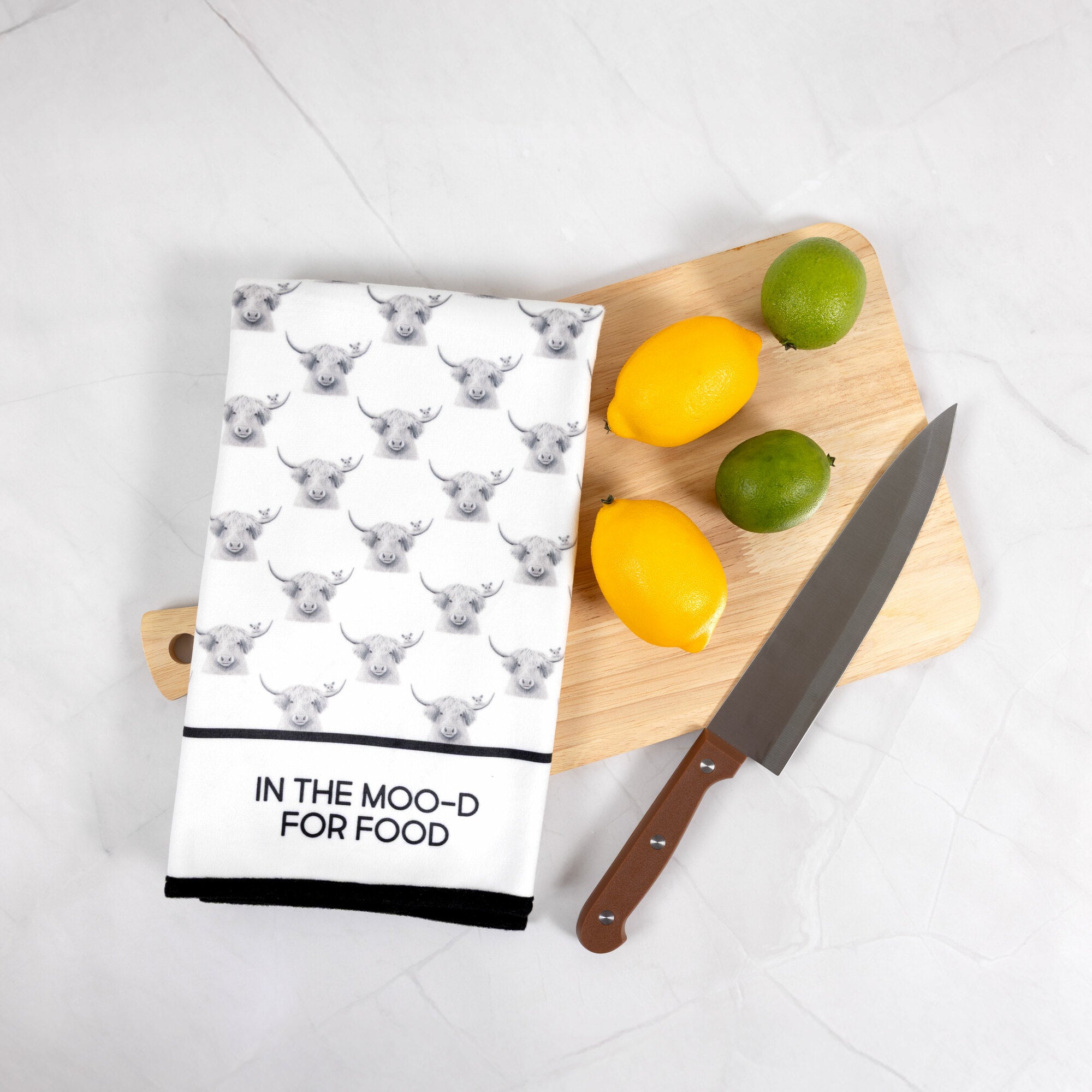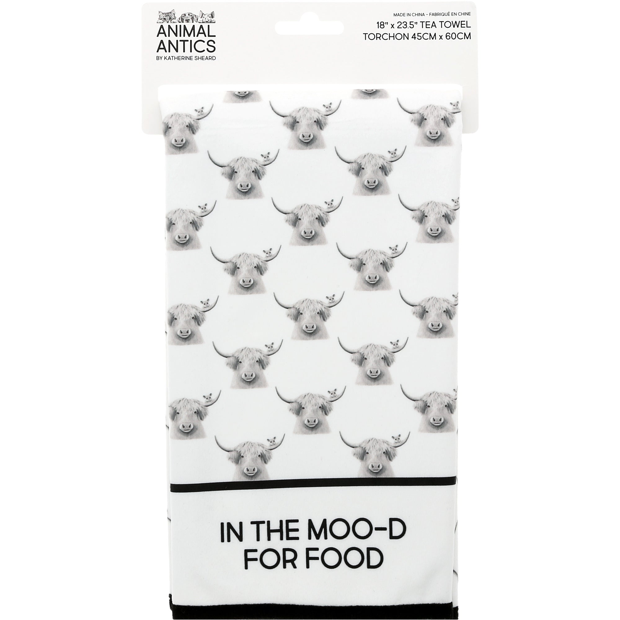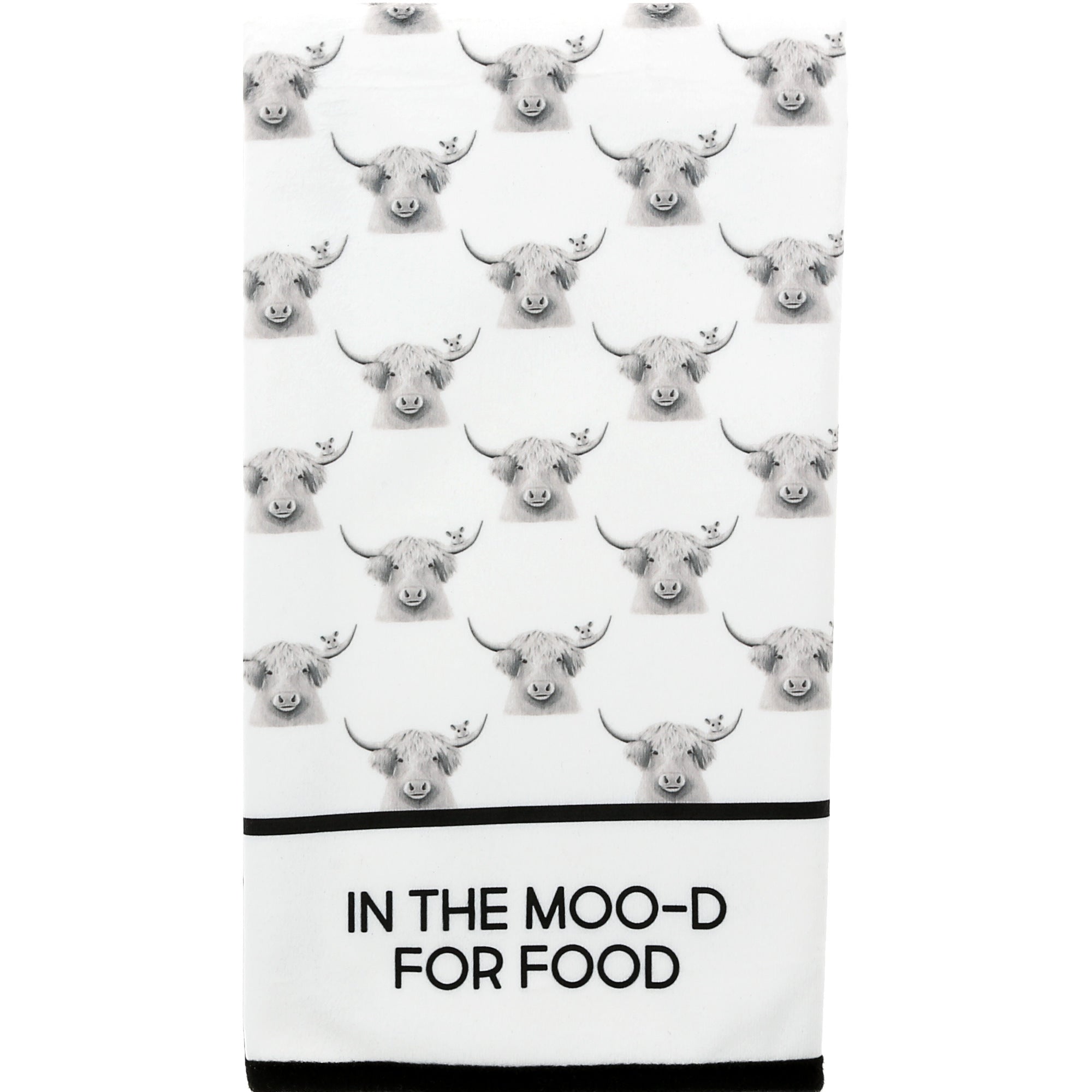 • IN-HOUSE DESIGN: Printed with multiple illustrations of laid-back cows and the phrase “In the Moo-d for Food,” this towel is part of Katherine Sheard’s Animal Antics series. The artwork adds a playful country flair that’s perfect for farmhouse kitchens and lovers of puns and animals alike.