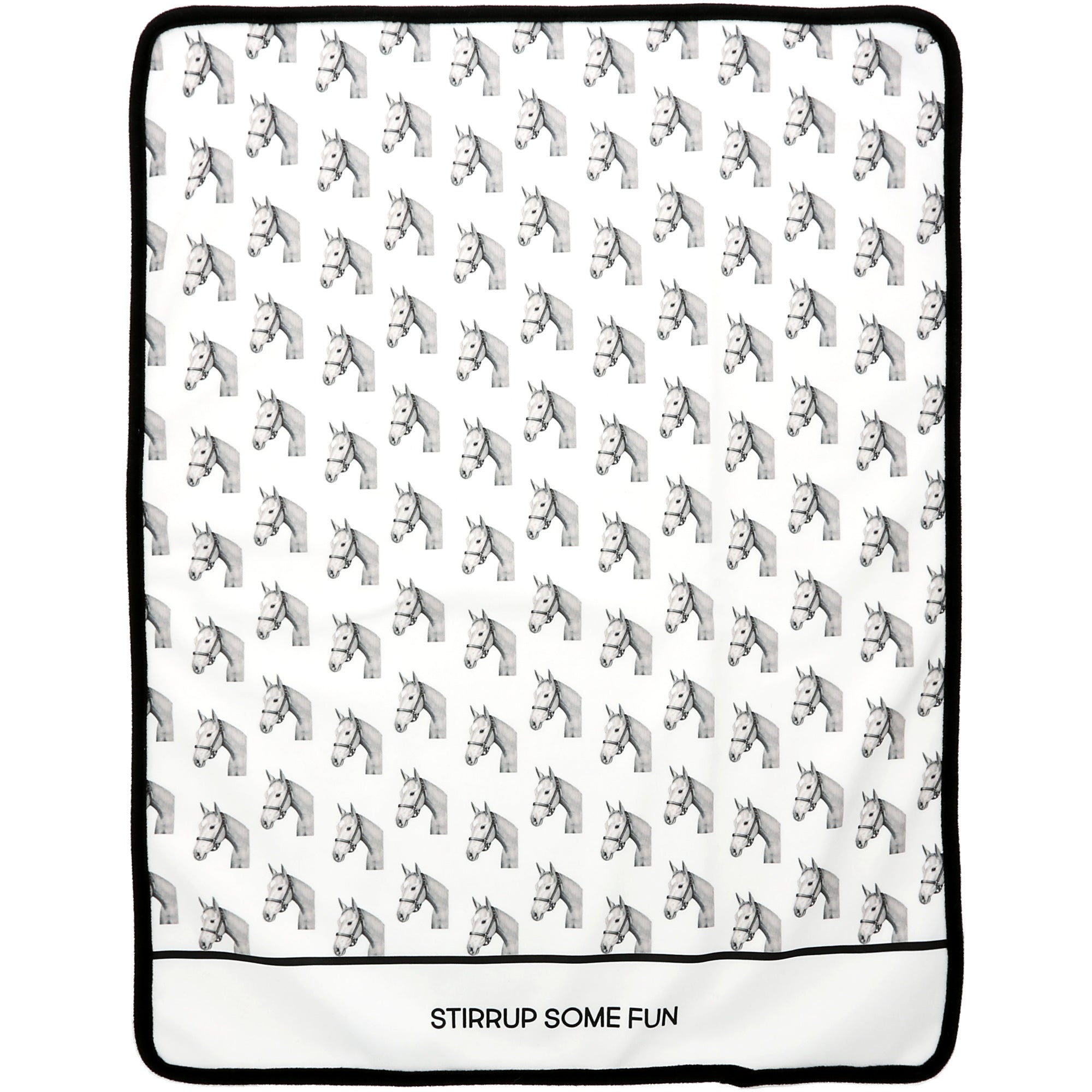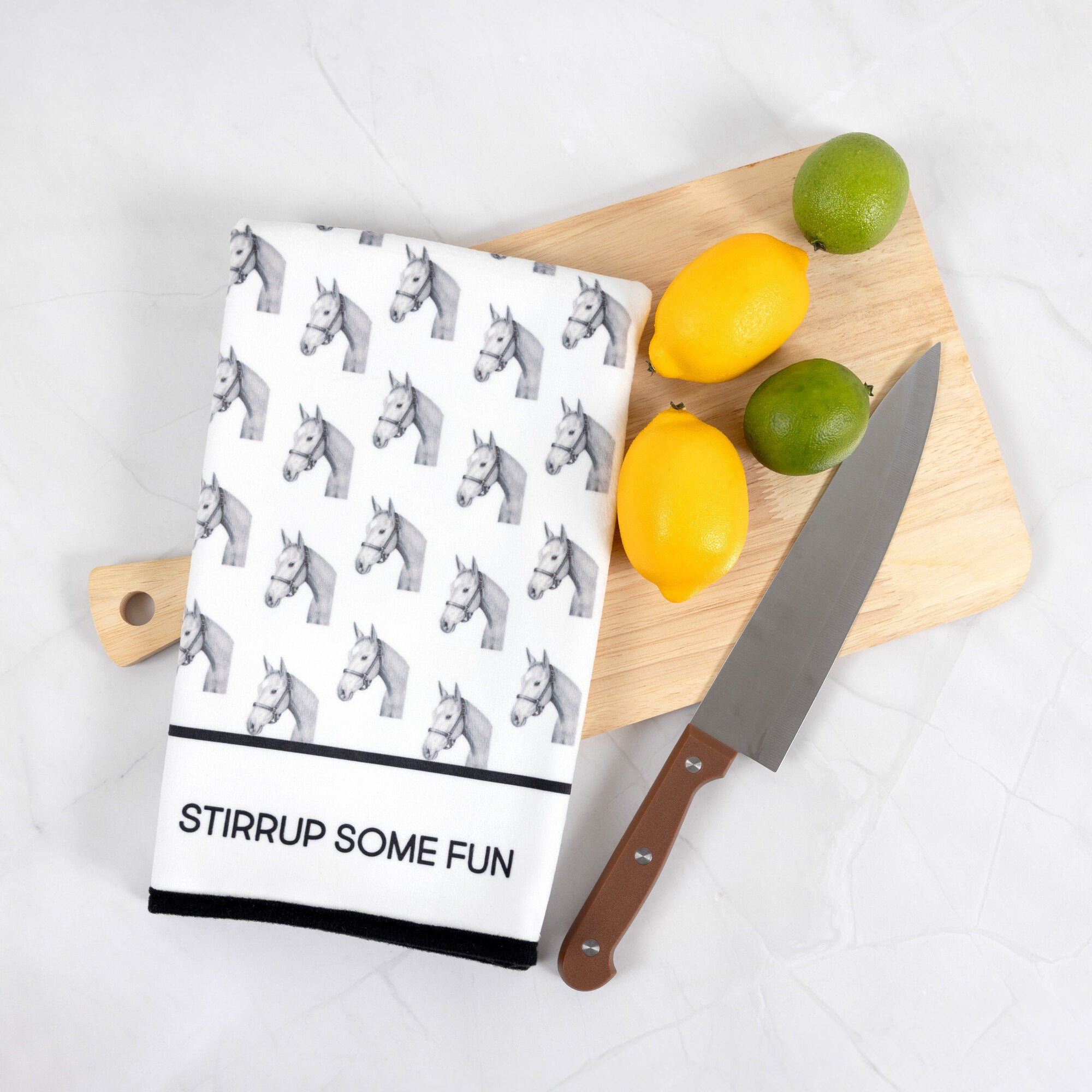 - IN-HOUSE DESIGN: Features a repeating pattern of illustrated horses, paired with the phrase “Stirrup Some Fun” printed across the front. This quirky and punny design is part of the Animal Antics collection by artist Katherine Sheard, offering a whimsical way to add equestrian charm to your kitchen.