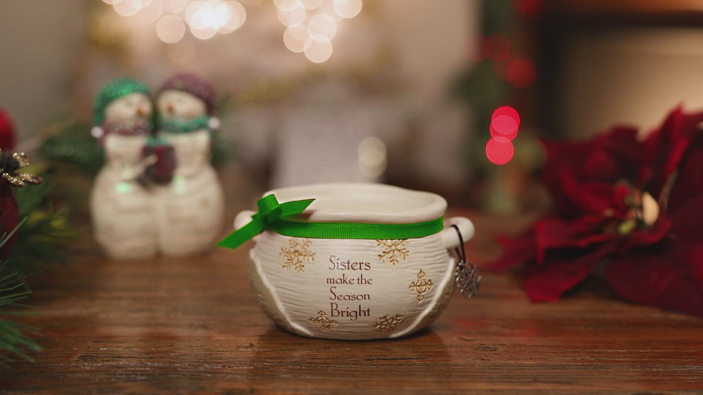 • PREMIUM QUALITY: This 9 oz 100% soy wax pine tree fir-scented candle fills an organic-shaped ceramic vessel that will fit into modern neutral-styled homes. The single lead & nickel-free cotton wick provides a smooth burn when each wick is cut down to 1/4" after burning. The candle will burn for 20-30 hours in total. The front of the candles has an actual bow-tied grosgrain ribbon, a resin charm, mini handles, a snowflake design, and a "Sisters Make The Season Bright" sentiment.