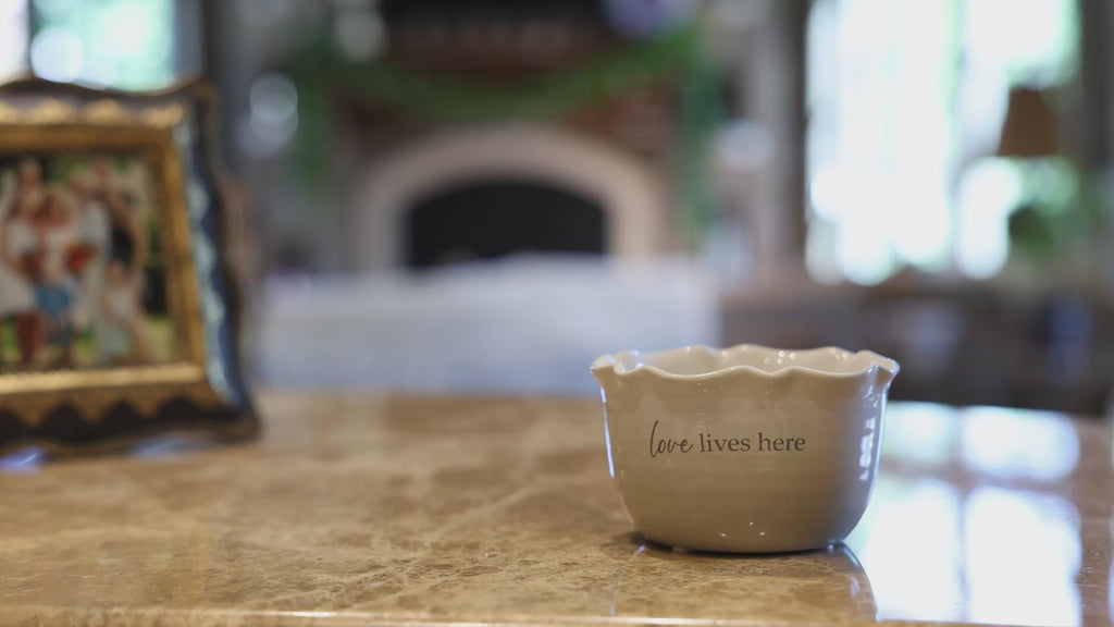 - IN-HOUSE DESIGN: The new & innovative candle offers a unique message for your loved one within the wax as time progresses. You will see cursive written "Filled With Love" sentiment after about 10 minutes. As you watch, the entire decal will appear after 60 minutes. Then, the message will hide again and reappear with each burn. The front of the candles has a simplistic "Love Lives Here" decal accompanied by an ombre white & tan pattern.