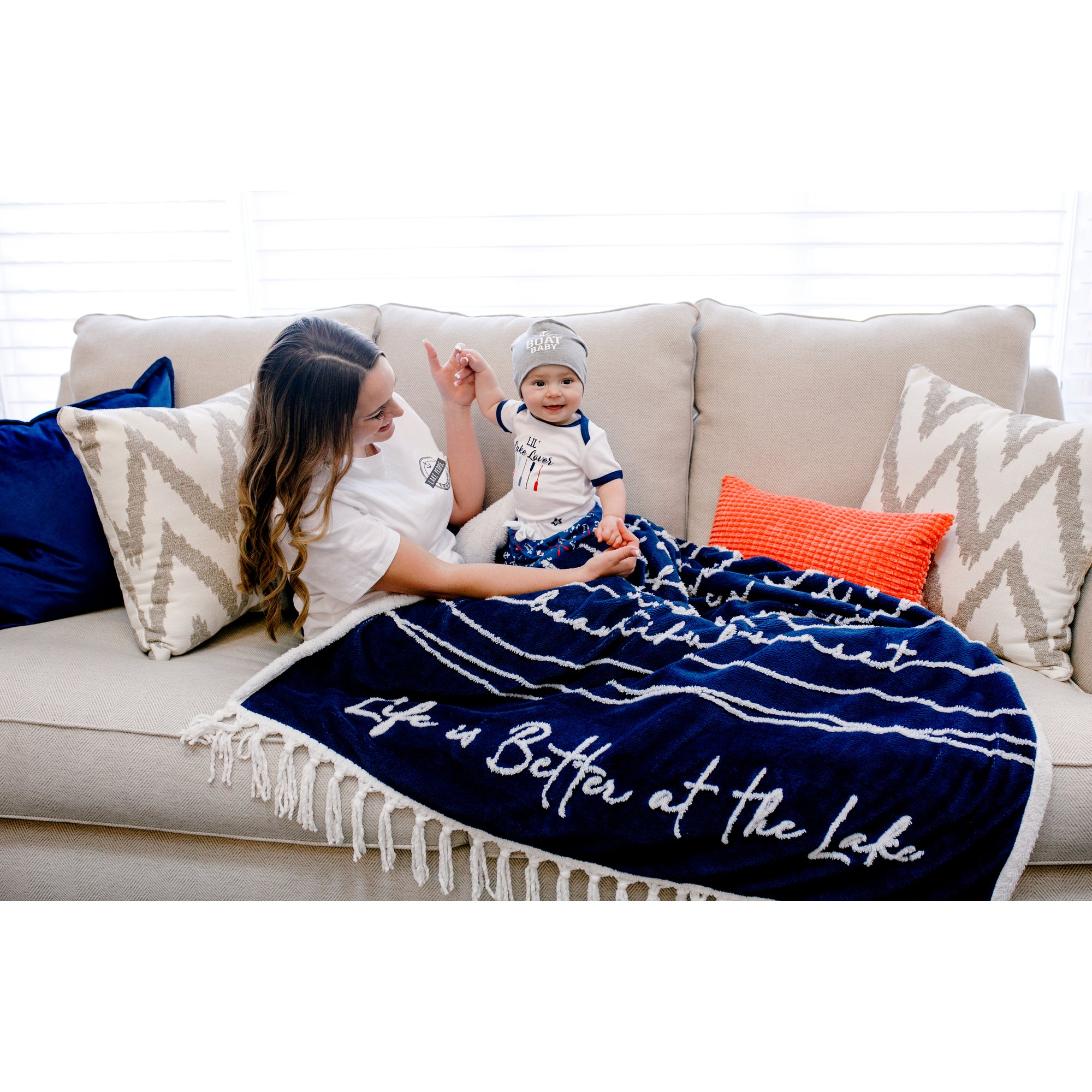 - IN-HOUSE DESIGN: Risen cursive sherpa "All Around Us Is Peaceful And Calm, Near The Lake Is Where We Belong. This Will Always Be Our Happy Place, Where We Go To Relax And Our Worries Erase. Life At The Lake Is As Perfect As It Gets, With Each Sunrise And Every Beautiful Sunset. Life Is Better At The Lake" sentiment is conveyed by wave-like thread lines connecting the ends of the words to the edge of the blanket on a beautiful deep navy background.