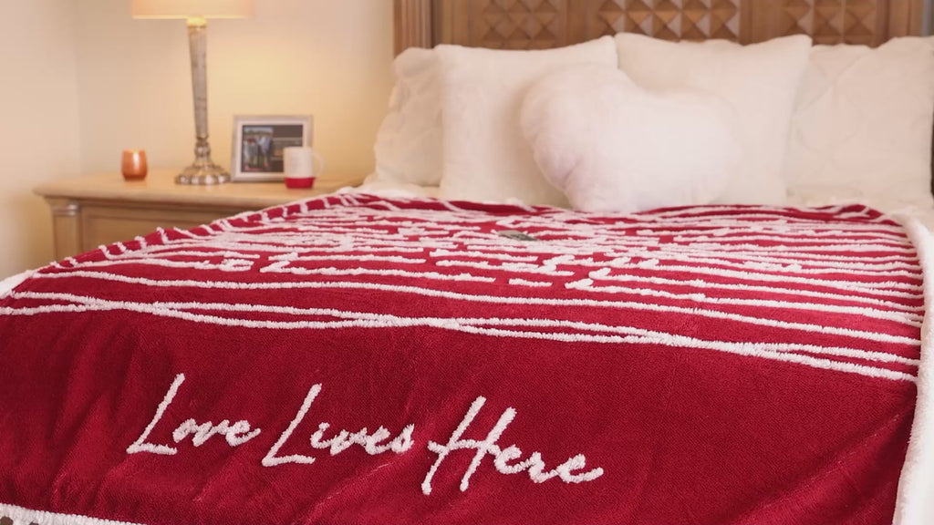 • IN-HOUSE DESIGN: Risen cursive sherpa "Home Is Where Love Resides, Memories Are Created, Friends Always Belong, Each Room Holds Laughter, Every Window Is Open To Possibilities, And Everyone In Your Heart Is Comforted With Warmth. When You Fill A House With Love, It Becomes A Home. Love Lives Here" sentiment is conveyed by wave-like thread lines connecting the ends of the words to the edge of the blanket on a beautiful warm red background.