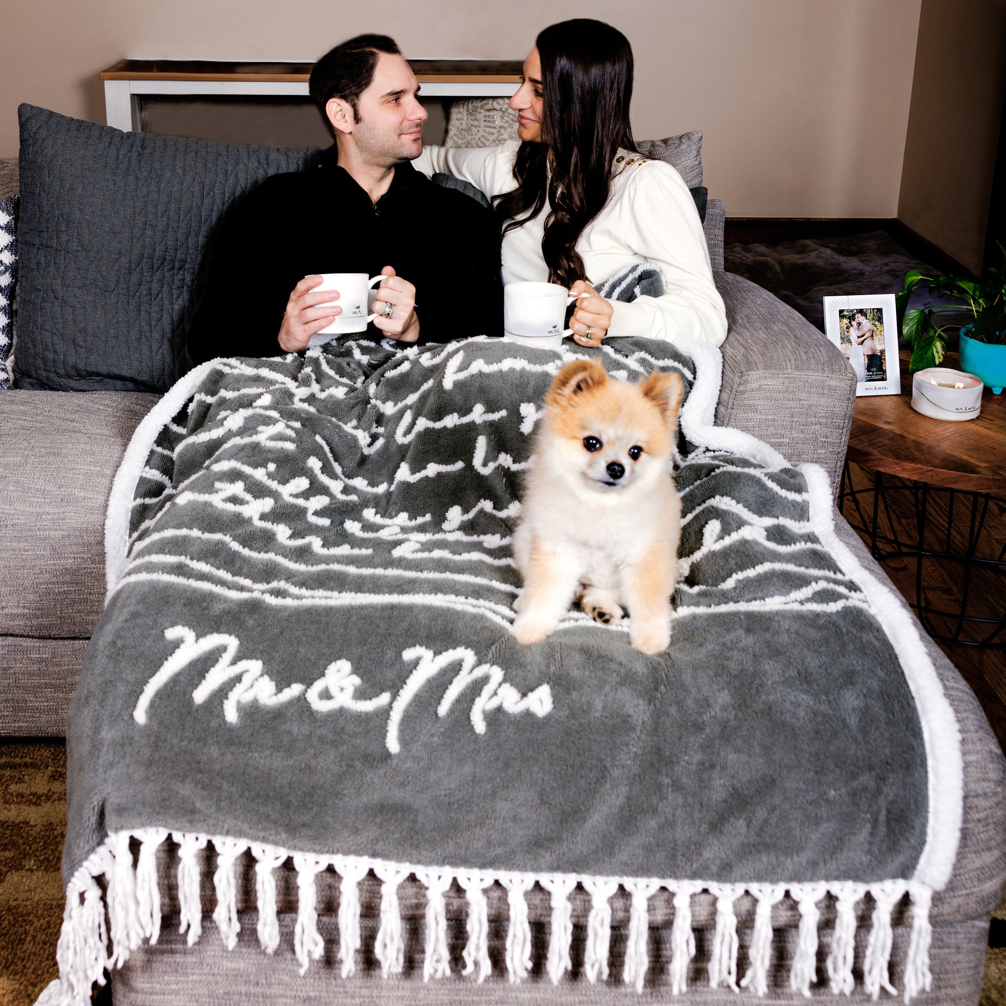 - IN-HOUSE DESIGN: Risen cursive sherpa "Now That We Have Said “I do,” I Can’t Wait To Spend Forever With You. Our Lives Entwined, Our Future To Explore, As We Create This New Family, I Could Not Love You More. We Are So Lucky That As We Grow Old, We Will Always Have Each Other’s Hand To Hold. Mr. & Mrs." sentiment is conveyed by wave-like thread lines connecting the ends of the words to the edge of the blanket on beautiful dark gray background.