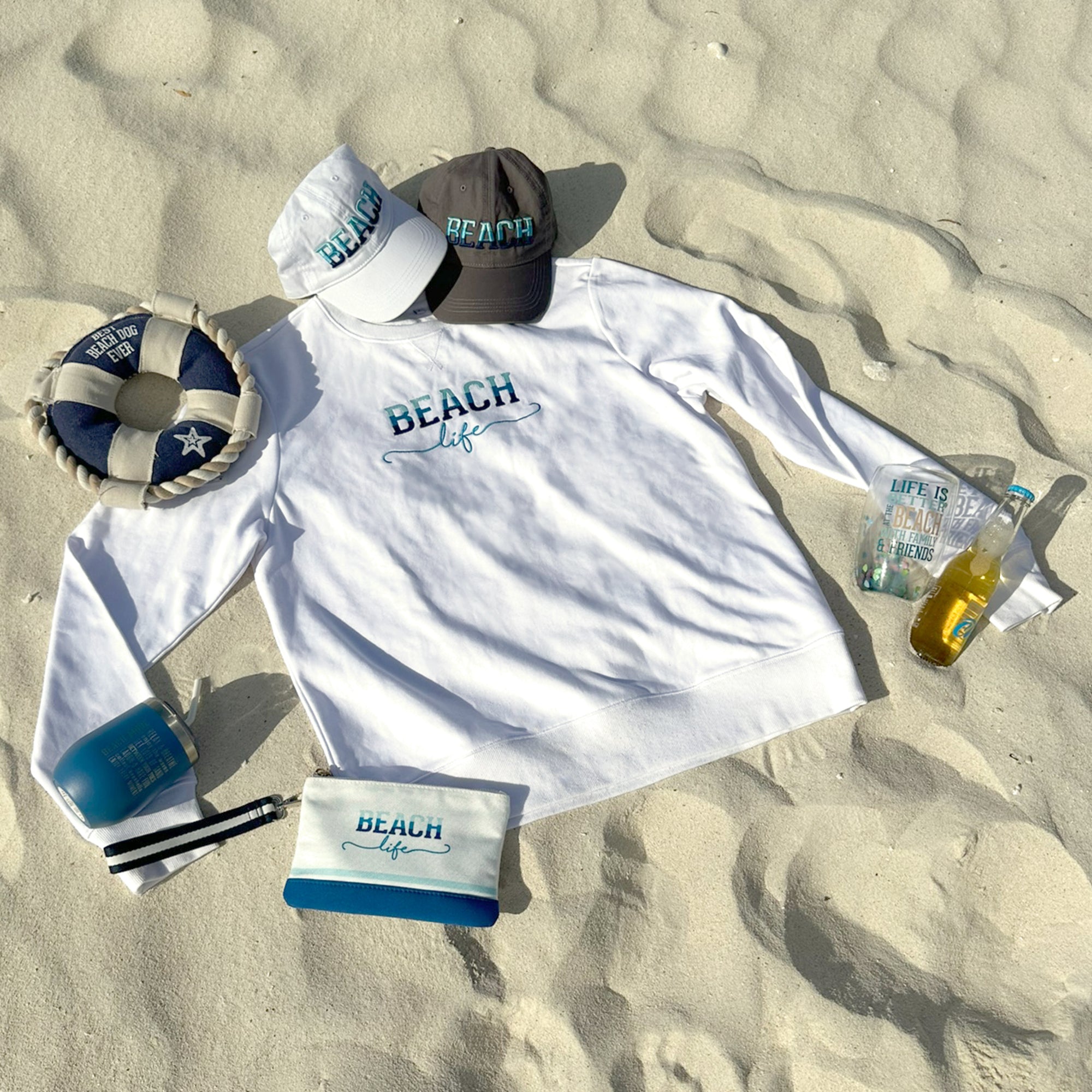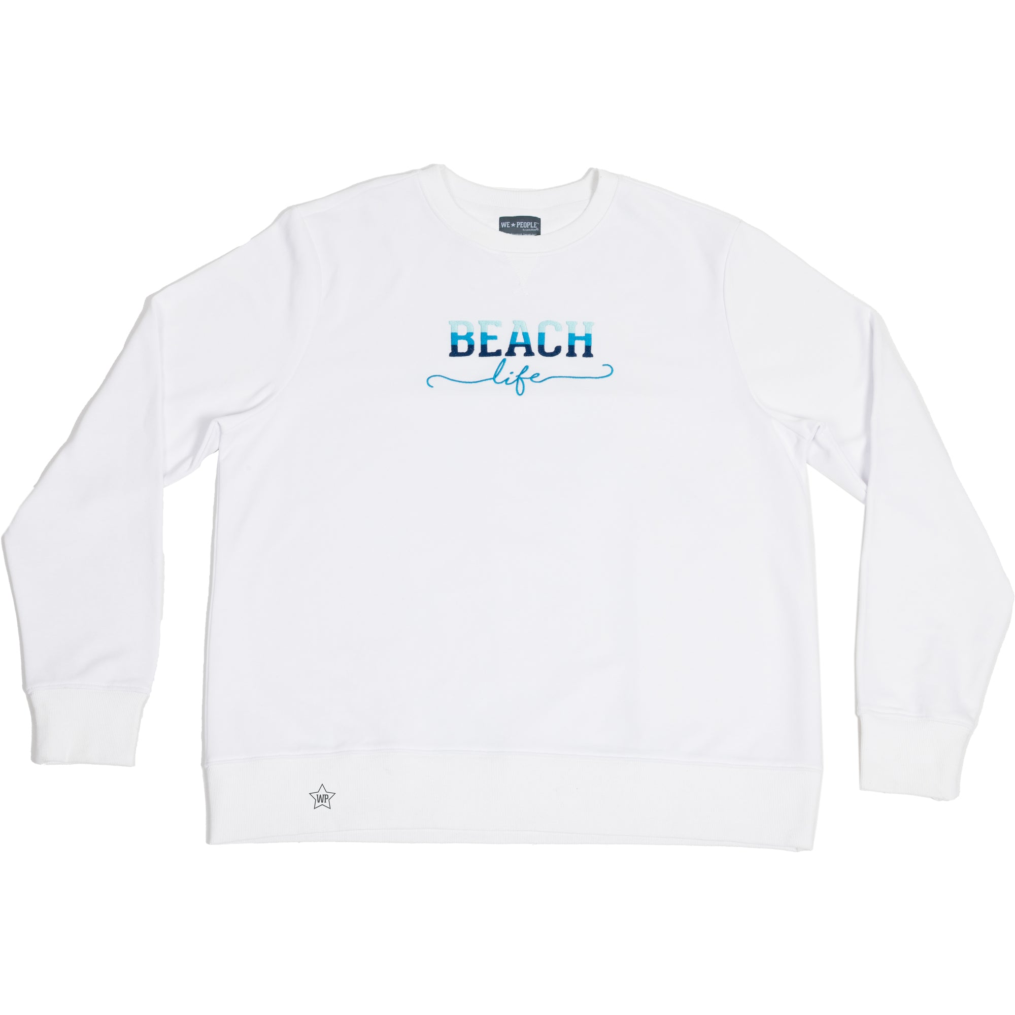 - IN-HOUSE DESIGN: The petite gray star icon is embroidered into the sweater's hem. The embroidered "Beach Life" sentiment sits in the center of the chest in a tri-color beach aqua and blue striped pattern. Size down for a regular women's fit, or order what you'd typically wear for a looser fit. These are also available in M/L and L/XL.