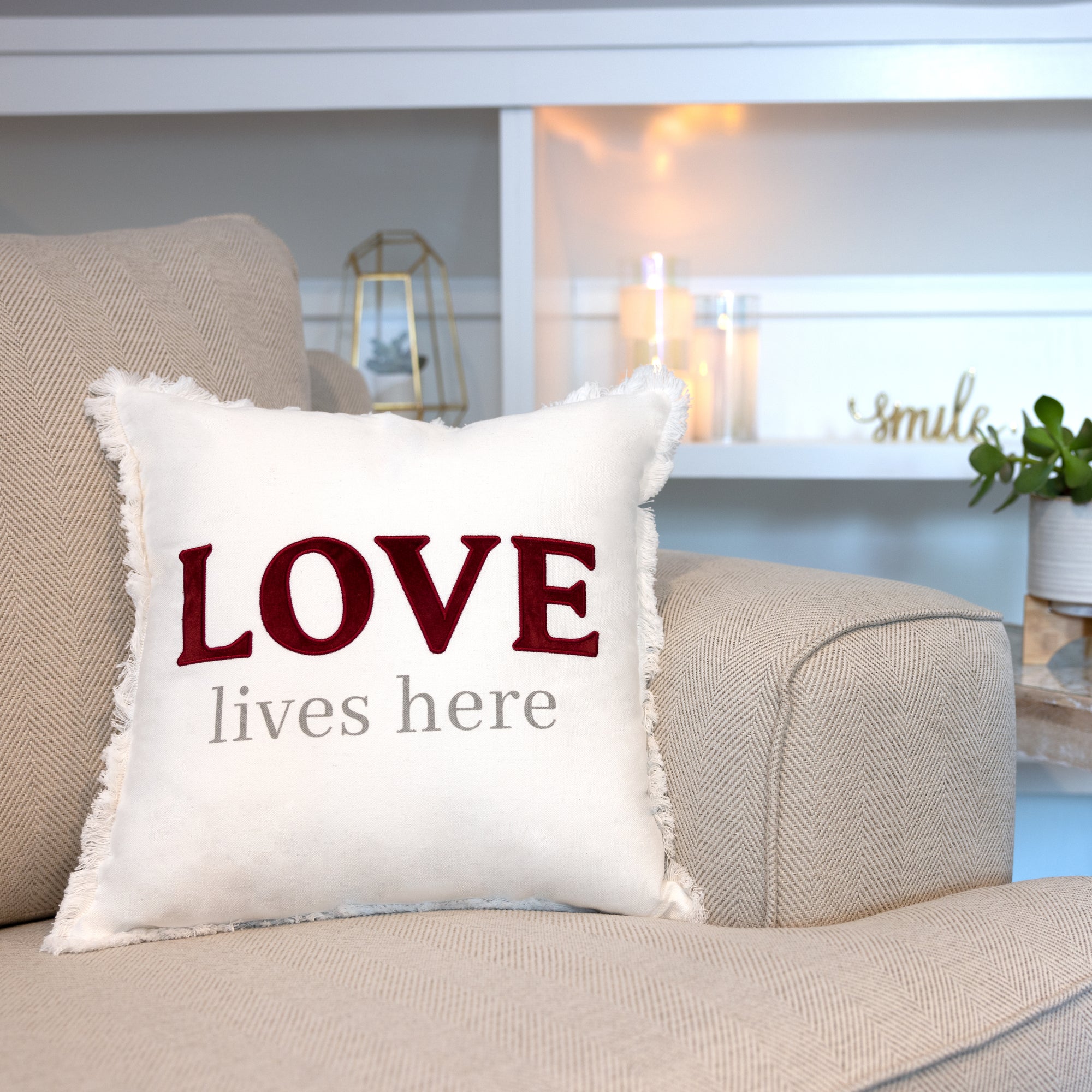 - IN-HOUSE DESIGN: "Lives Here" sentiment is screen printed onto the front side of the case, whereas "Love" is a velvet-finished applique sewn above.