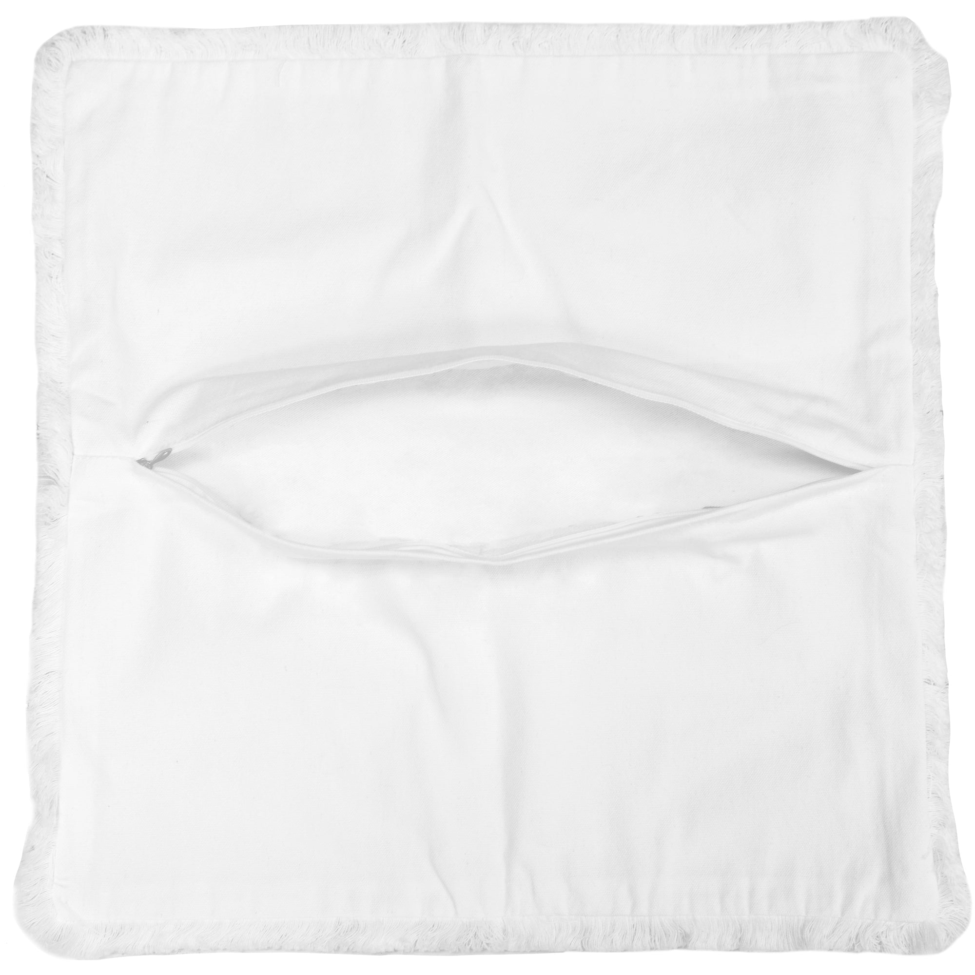 • PREMIUM QUALITY: 18" square pillow cover is a luxurious poly-cotton blend consisting of 70% polyester, 30% cotton, and a soft-touch 290 GSM. All surrounding edges have a .75" white polyester fringe. The backside center features a hidden white/clear zipper track with a silver metal pull for easy removal and cleaning.