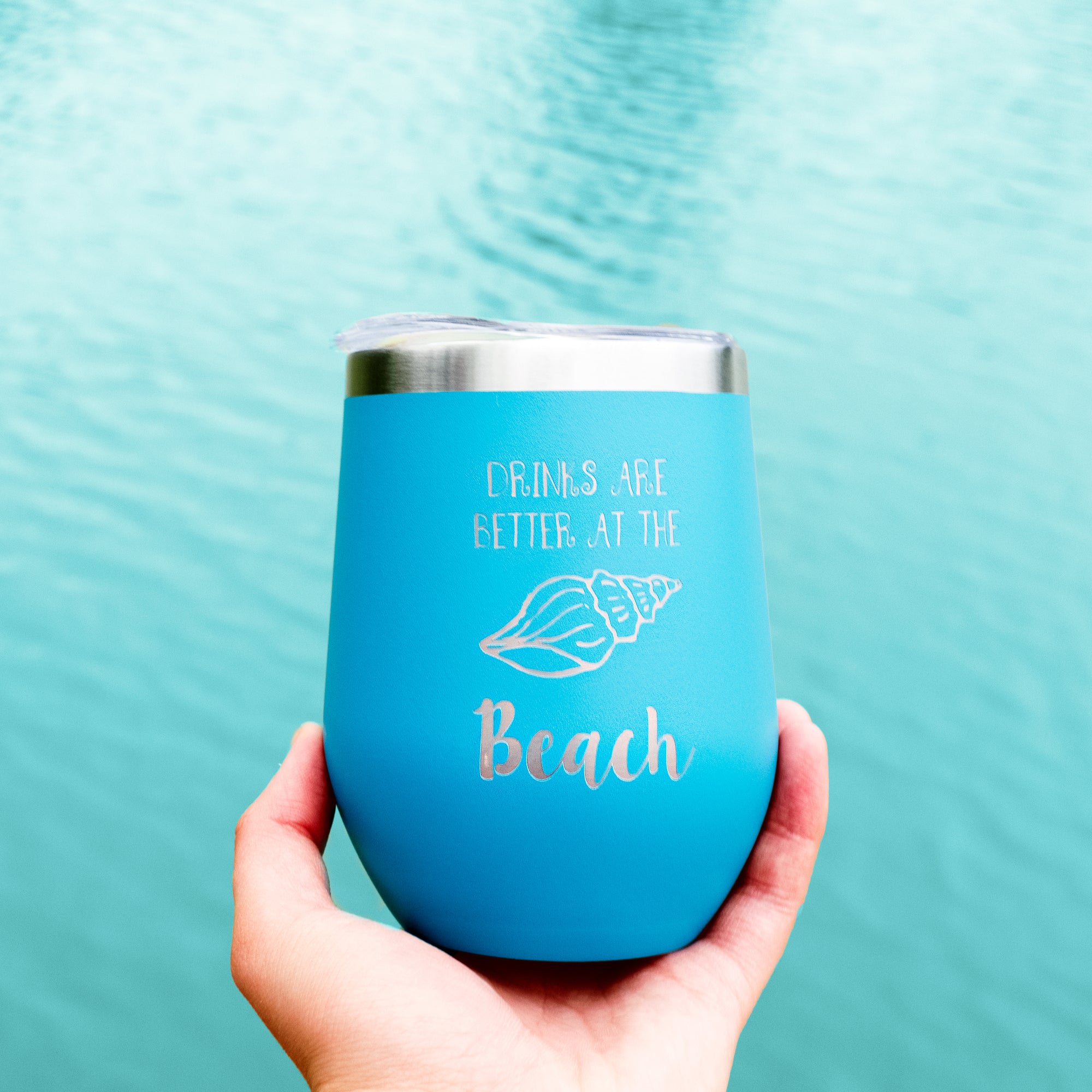 - IN-HOUSE DESIGN: The teal-blue matte powder-coated body has an exposed stainless-steel lip and is debossed/engraved onto the front "Drinks Are Better At The Beach" and seashell design.