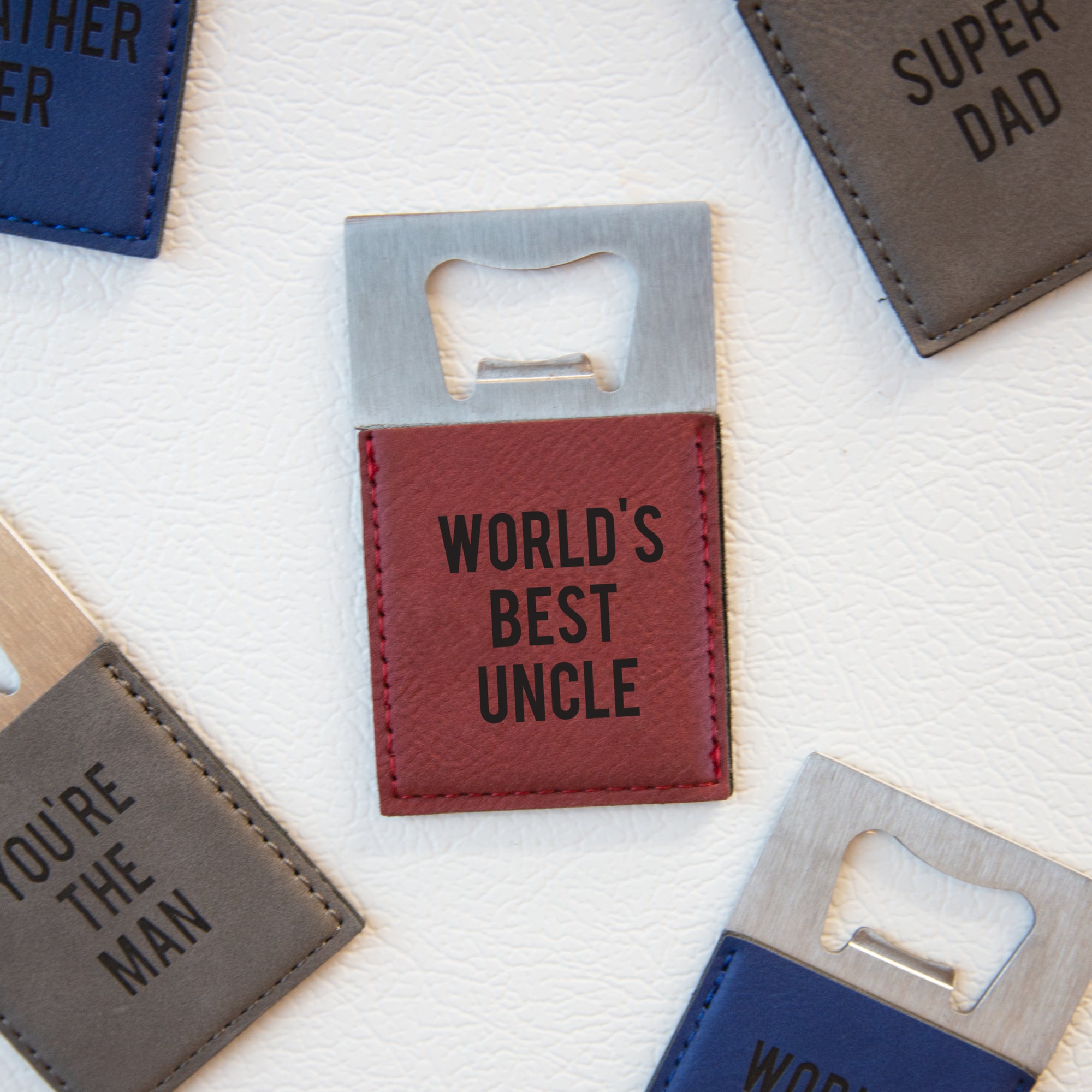 • IN-HOUSE DESIGN: "World's Best Uncle" text is laser-printed onto the front of the bottle opener.
