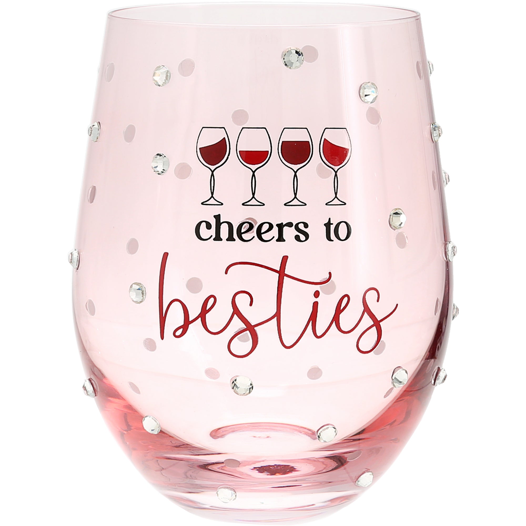 - IN-HOUSE DESIGN: Features a blush-pink tinted glass decorated with scattered gem accents and a playful trio of wine glasses above the sentiment “cheers to besties.” The script lettering and gem pattern create a stylish, feminine look that stands out on bar carts, dining tables, and gift displays.