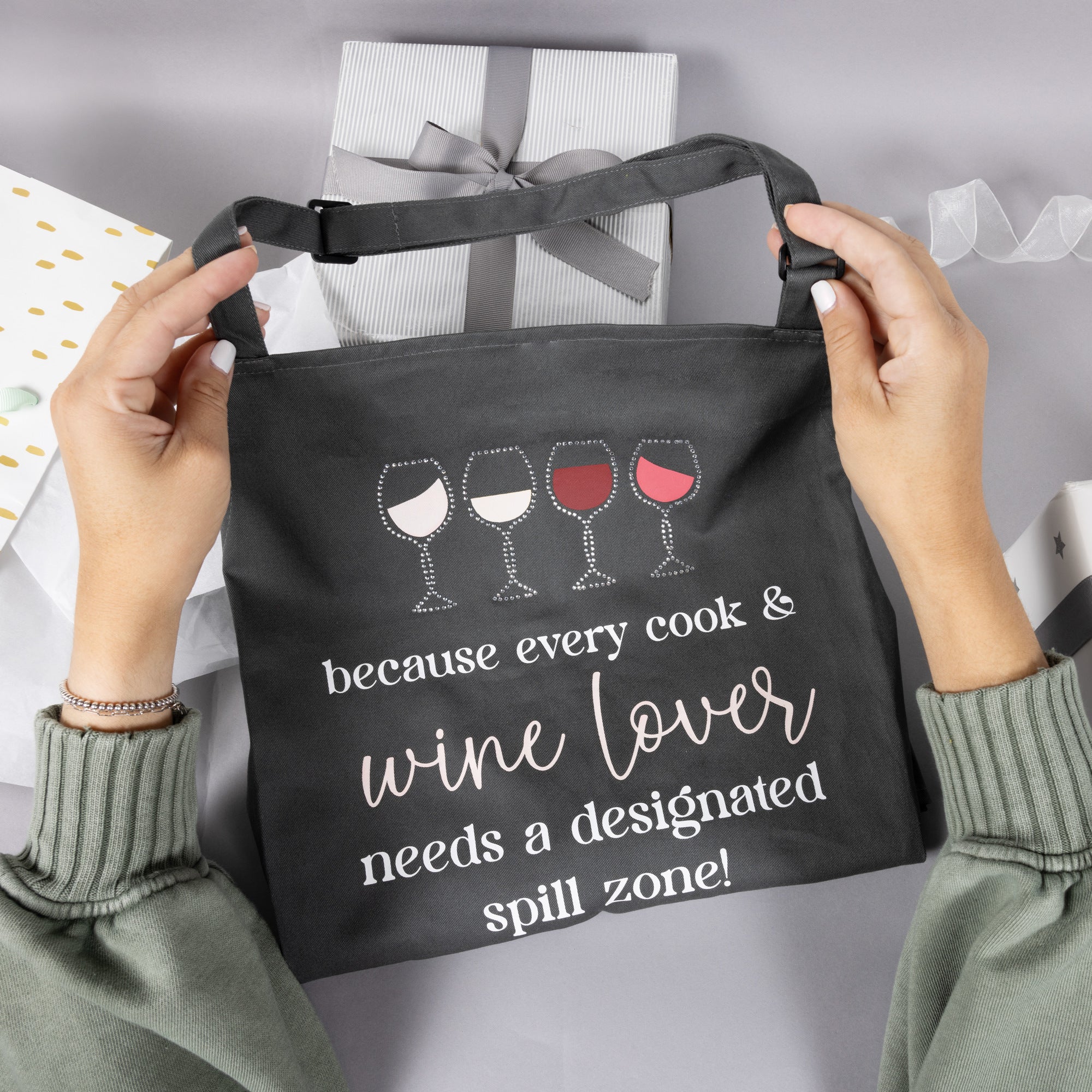 - IN-HOUSE DESIGN: Featuring the fun and relatable message, "Because every cook & wine lover needs a designated spill zone," printed on the front, this apron combines style with functionality. The design is enhanced with gem accents that add a touch of sparkle to the printed wine glasses. The apron also features an adjustable neck strap with a metal slide for a perfect fit, making it a one-size-fits-all solution for all body types. The apron’s sleek black color and modern typography make it a fashionable and practical kitchen essential.