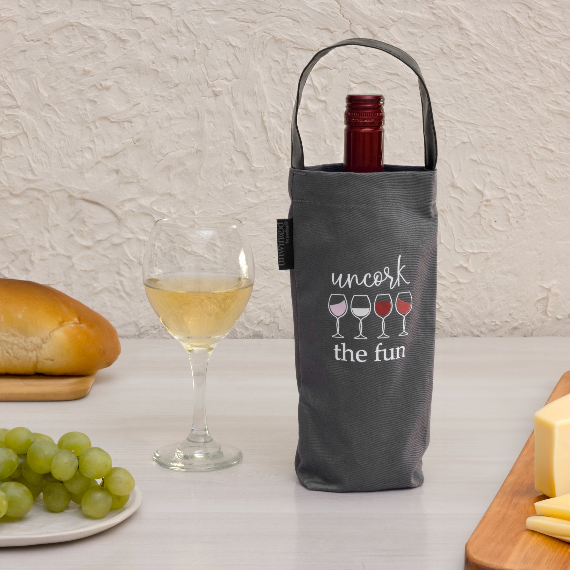 - IN-HOUSE DESIGN: With the fun and festive phrase "Uncork the Fun" printed alongside illustrated wine glasses, this bag is designed to bring a smile to any gathering. The artwork is carefully printed to ensure it stands out, while a small sewn-in logo tag subtly adds to the high-quality look. It’s perfect for adding a touch of personality and humor to your wine presentation.