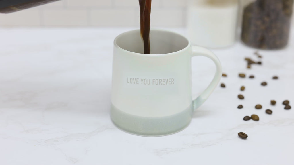 - IN-HOUSE DESIGN: The hand-dipped 1/3 gray-colored bottom is unique to each piece. The tan debossed "Love You Forever" sentiment is stamped in the middle center of the white upper half of the front side of the cup. This simplistic, modern-styled mug is the perfect addition to any drinkware collection.