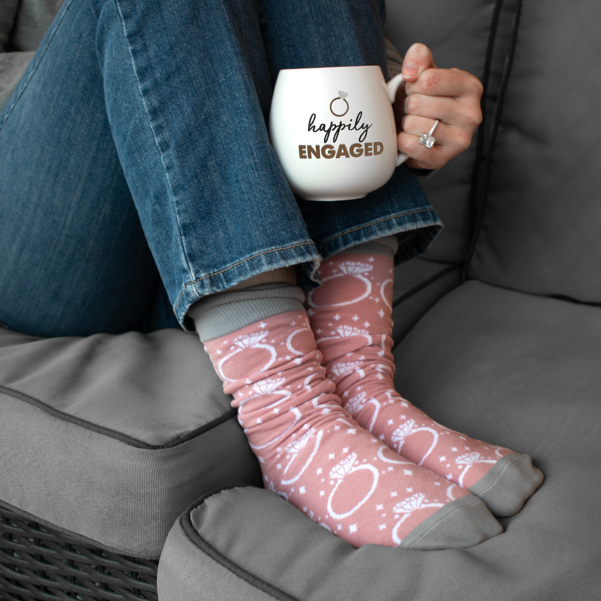 - IN-HOUSE DESIGN: Socks feature a star sparkle and engagement ring pattern in white on a pink background. The heels, toes, and ankles are gray. The mug has a black, gray, and metallic gold "Happily Engaged" sentiment with a ring.