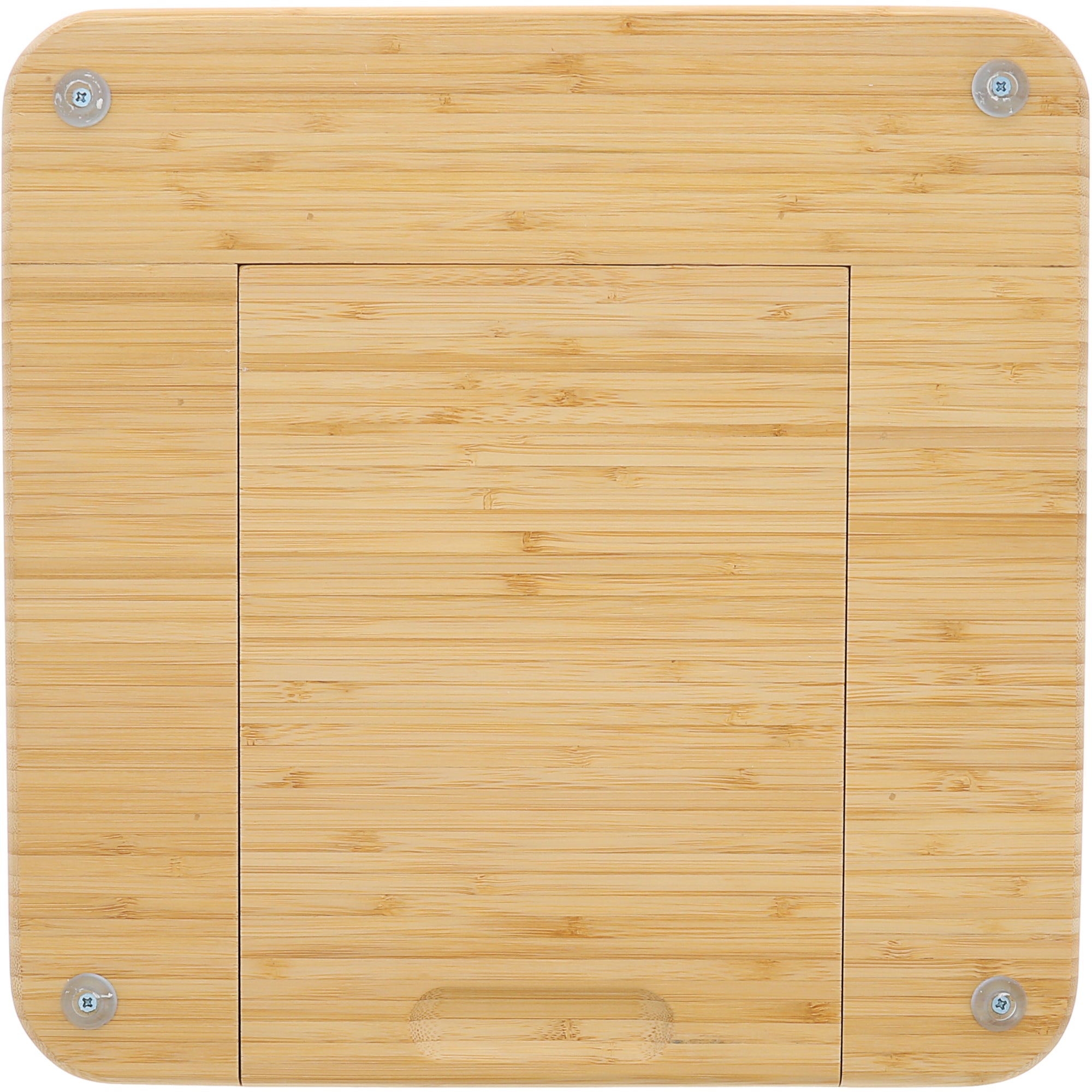 - PREMIUM QUALITY: 13" square x 1.25" tall cheese or bread serving board has rounded edges and is made from bamboo. The outer edge of the board features grooved edging to hold an assortment of cheese, crackers, meats, nuts, dried fruits, and more for enjoying. The bottom side of the board features four silicone feet that are secured by metal screws to prevent your table and countertops from being scratched. The 7.375" x 9.75" x 0.75" pull-out drawer features a 3.5" grooved handle for easy opening. Inside the drawer are four utensils, including a 4.75" cheese knife, a 4.75" cheese shaver, a 4.875" cheese fork, and a 5" cheese spreader; each which have their own storage space with room in between for easy access.