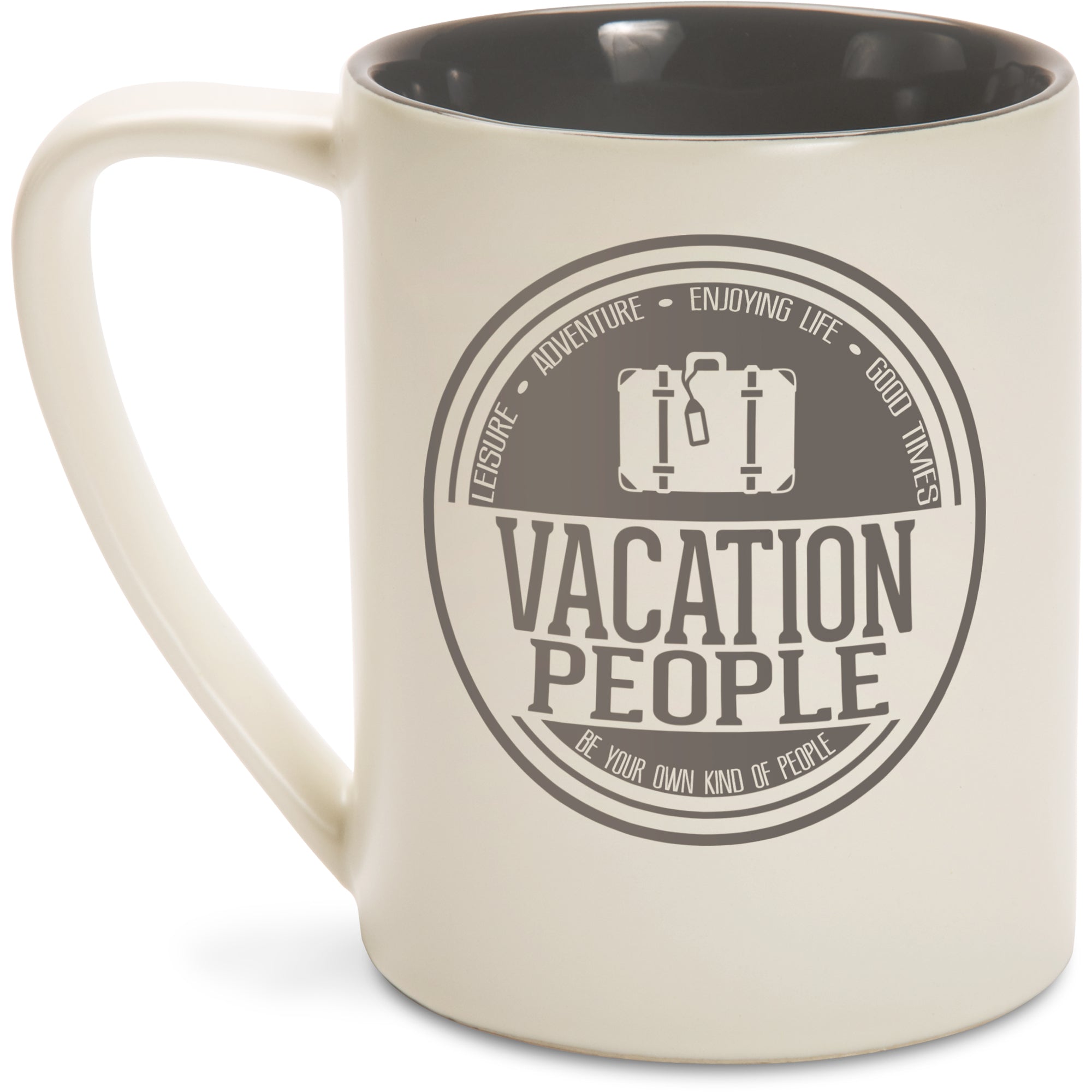 - IN-HOUSE DESIGN: "Vacation People" decal, including "Leisure - Adventure - Enjoying Life - Good Times" text is printed on both sides of the mug, as are the accompanying suitcase logo and "Be Your Own Kind Of People" text.