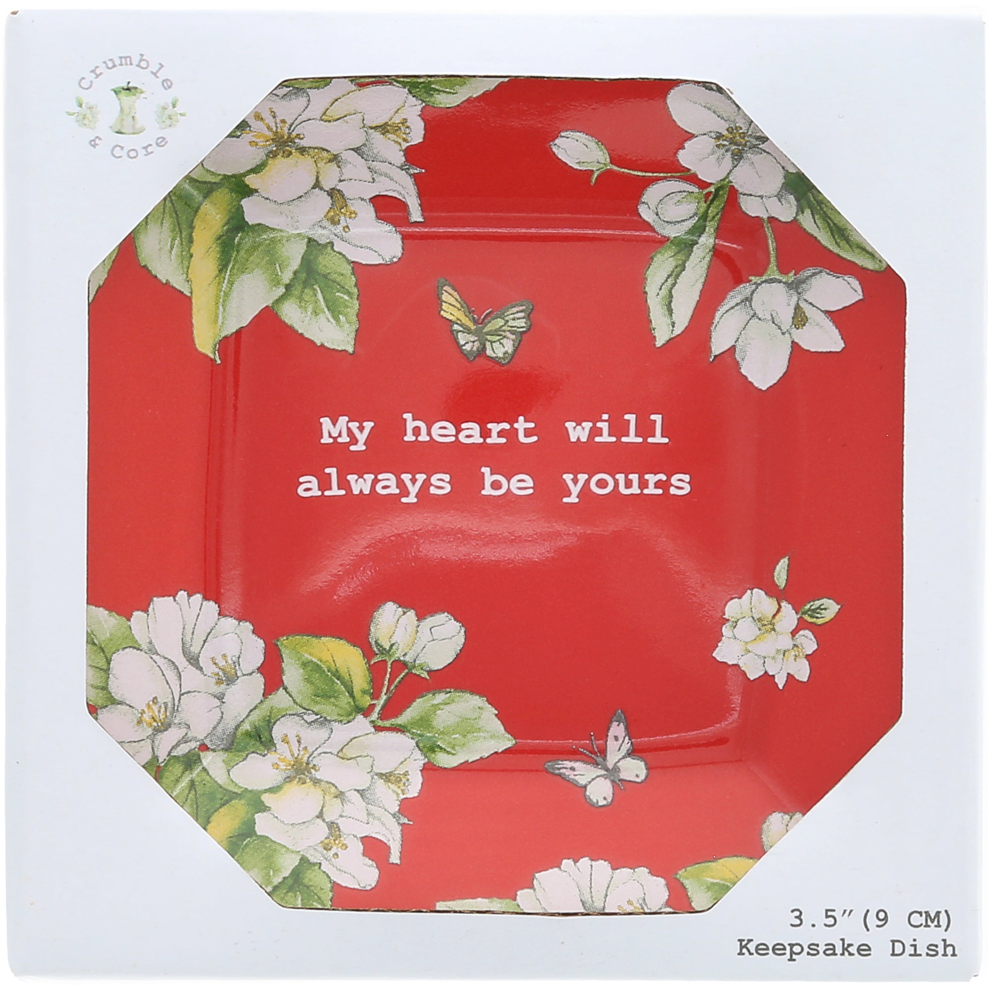 - IN-HOUSE DESIGN: The finish is glossy. The glossy sentiment in the white "My Heart Will Always Be Yours" is placed at the dish's center. The background is red with yellow butterflies and white and greenery floral patterns.