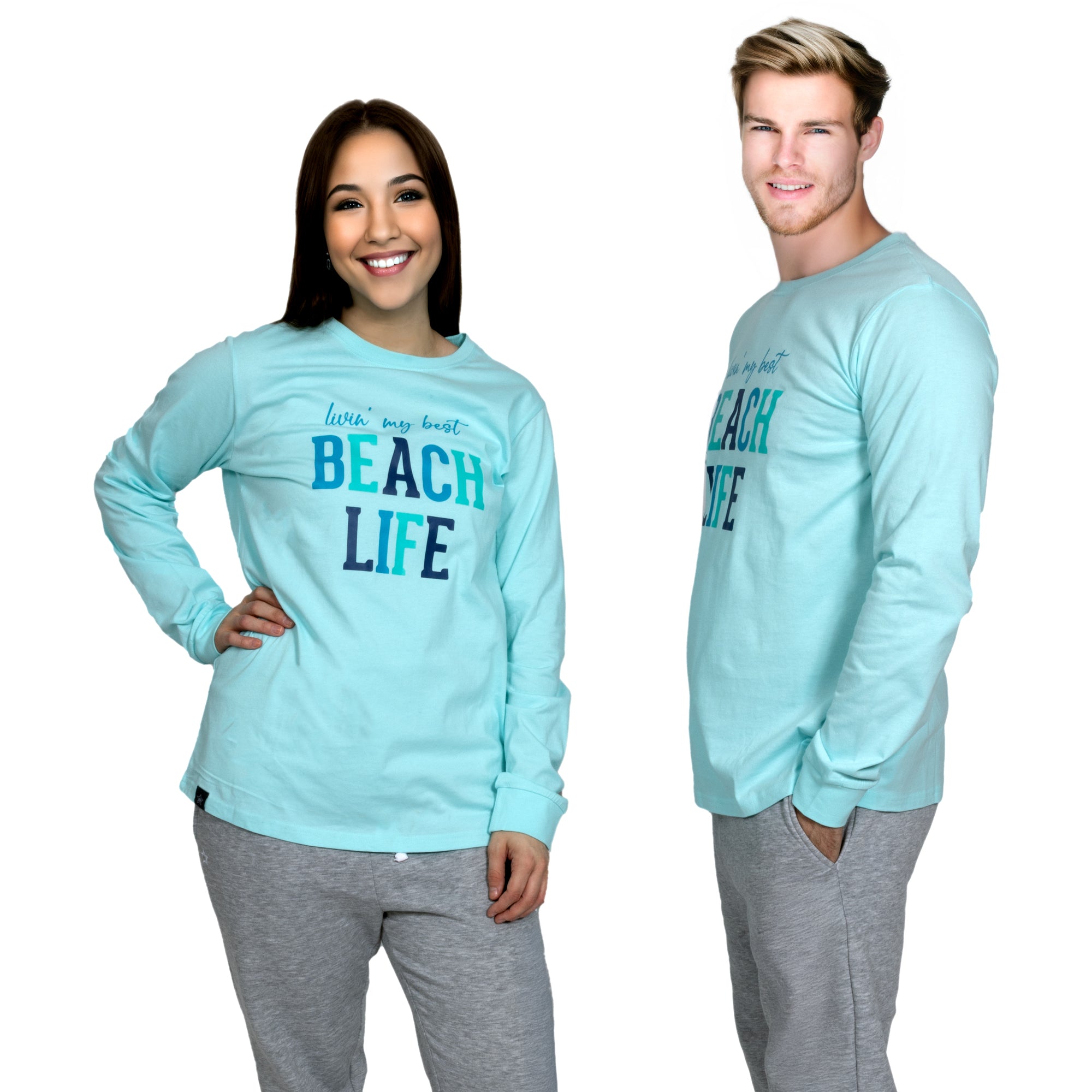- IN-HOUSE DESIGN: The "Beach Life" text is artfully printed across the chest in a striking blend of blue and teal, evoking the peaceful yet invigorating feeling of being by the shore. This minimalist design is impactful yet subtle, providing a versatile look that complements any beach lover’s wardrobe. The shirt’s tranquil teal color brings to mind the ocean’s beauty and the peaceful escape it provides, making it the perfect wearable expression of the beach lifestyle.