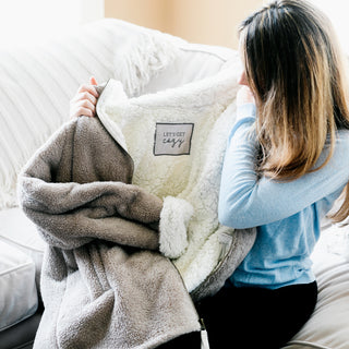 - IN-HOUSE DESIGN: "Let's Get Cozy" text is printed onto the embroidered square detail.