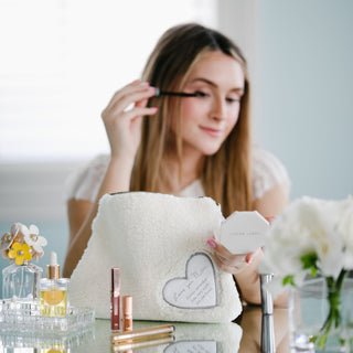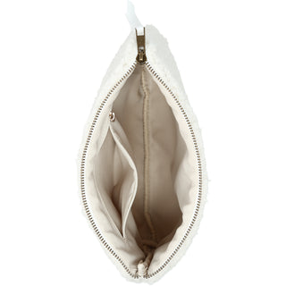 - PREMIUM QUALITY: 8" x 10" makeup bag is a 100% polyester cream sherpa exterior and a 100% cotton-lined cream interior. The zipper closures on both the single interior pocket and exterior top of the bag have bronze metal hardware. The front side of the travel case has a satin heart. Packaged in a plastic polybag with hangtag.