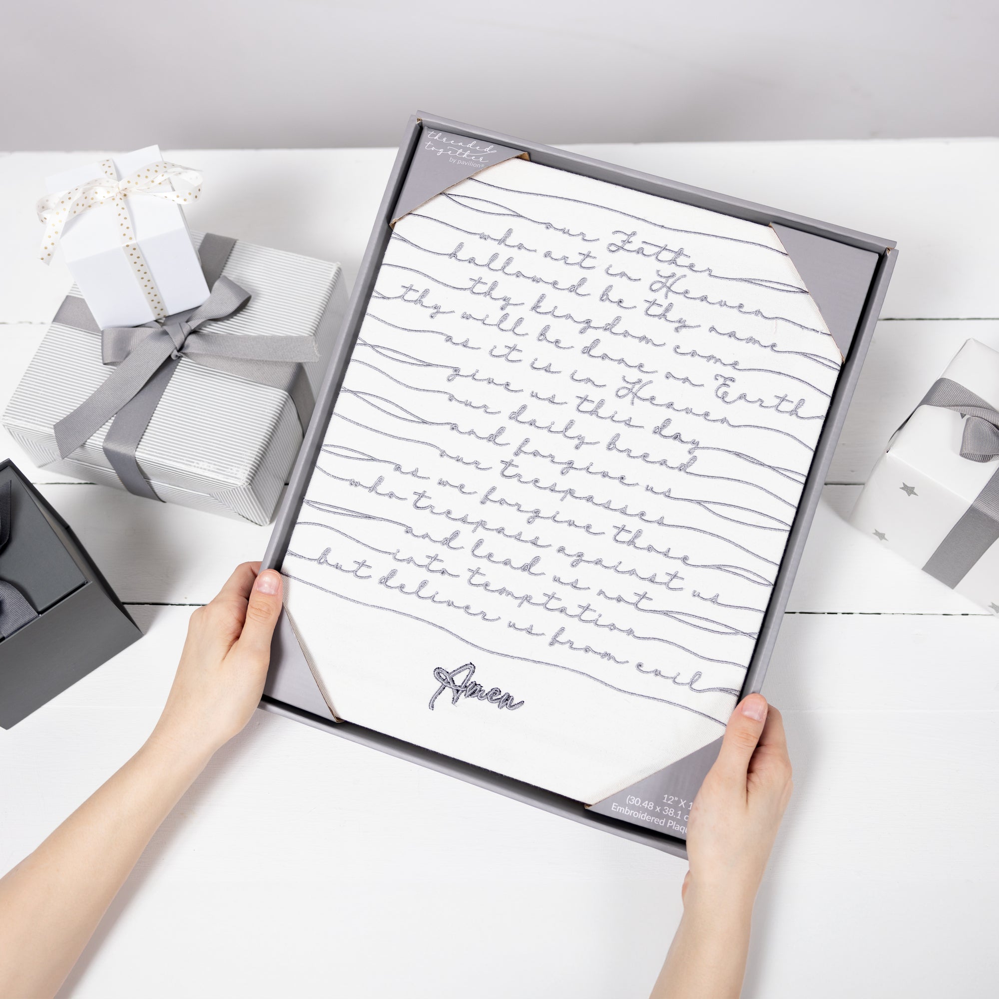 - IN-HOUSE DESIGN: The plaque combines gray waved threads and gray risen words "Our Father, Who Art In Heaven Hallowed Be Thy Name, Thy Kingdom Come, Thy Will Be Done On Earth As It Is In Heaven. Give Us This Day Our Daily Bread And Forgive Us Our Trespasses, As We Forgive Those Who Trespass Against Us, And Lead Us Not Into Temptation But Deliver Us From Evil. Amen," that wraps around the edges of the canvas.