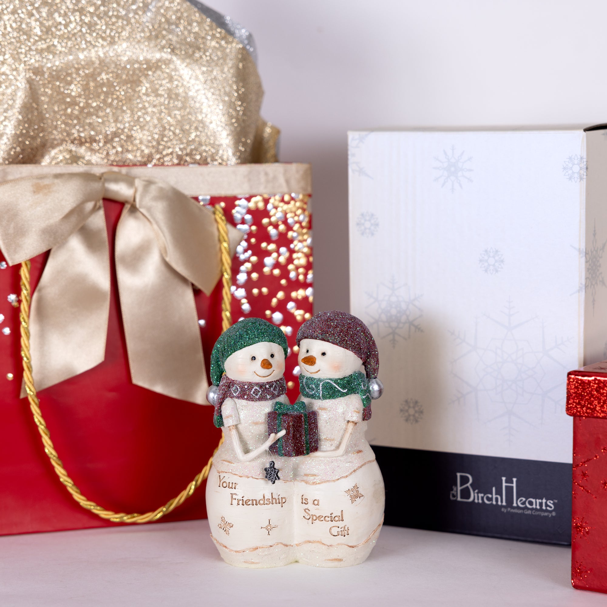 • IN-HOUSE DESIGN: "Your Friendship is a Special Gift" text is debossed and hand-painted onto the front of the figurine. The double snowman figure features a dangling snowflake, brushed nickel, Birchwood accents, and signature snowflake detailing. The snowman is topped with glitter, making this figurine the perfect choice for your holiday décor.