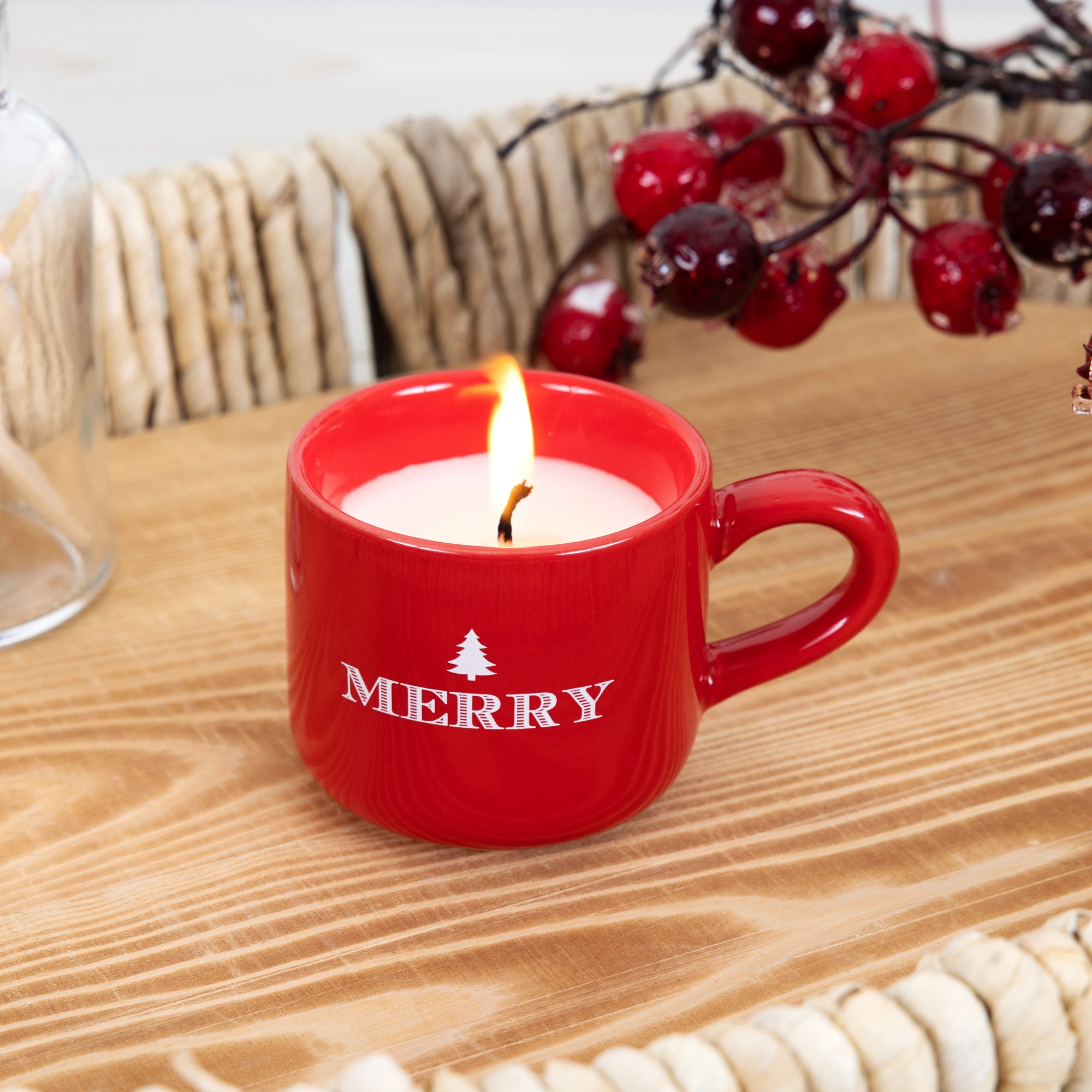 - IN-HOUSE DESIGN: A red mug with the white glossy sentiment "Merry" on the front side of the cup is accompanied by a white pine tree silhouette. The design faces towards you in the right hand or outward in the left hand.