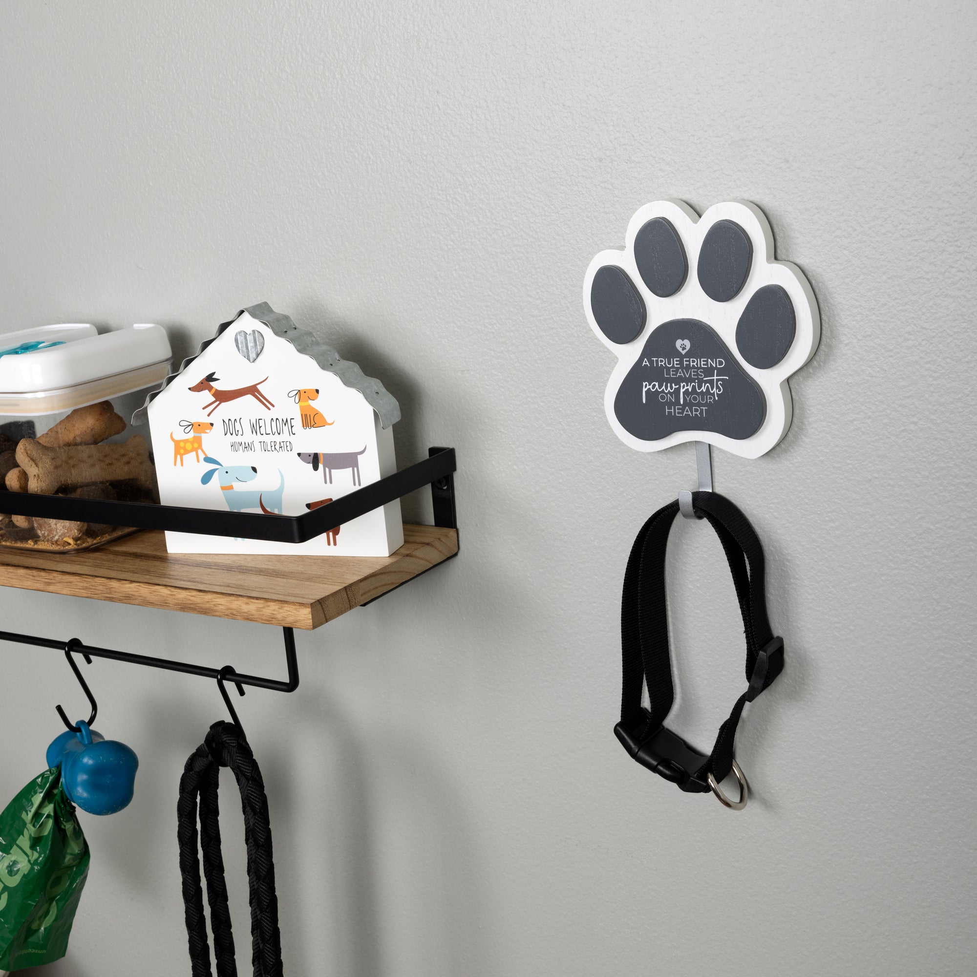 - IN-HOUSE DESIGN: The white finish has a raised gray 3D dog pawprint. The large pad has a white sentiment, "A True Friend Leaves Paw Prints On Your Heart," accompanied by a heart shape and a pawprint in the middle. Hang it next to the door to hold your dog's leashes, harnesses, waste bags, and collars, making them easy to find each time you get ready to go out together.