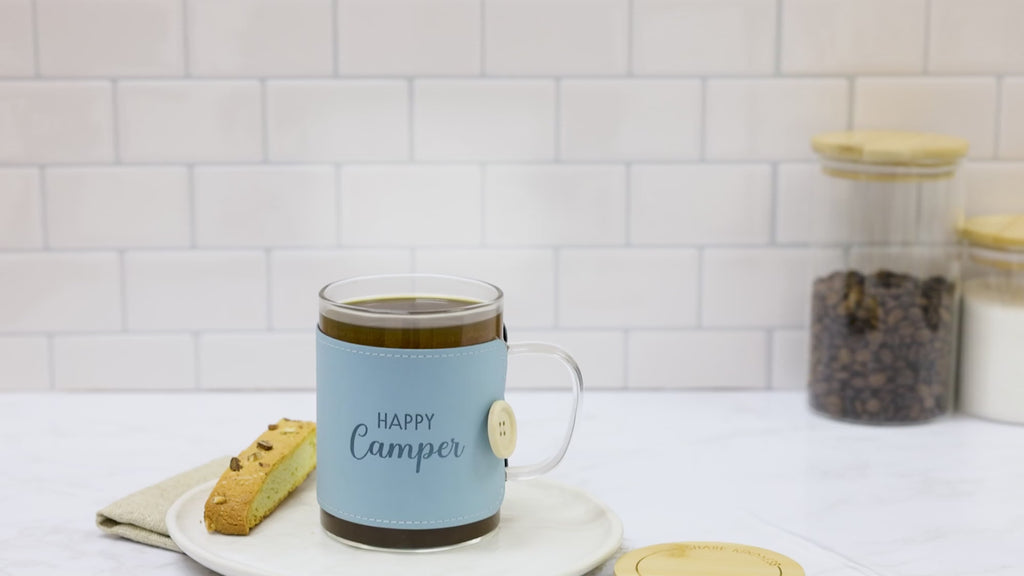 - IN-HOUSE DESIGN: Embrace the warmth of appreciation with this heartwarming drinkware adorned with a charming teal wrap. The wrap bears the loving sentiment "Happy Camper," exquisitely engraved, complemented by delicate teal stitching, a tan button, and a white elastic closure for a touch of elegance. Meanwhile, the coaster cap crafted from natural wood grain showcases a rounded "Share Kindness" text encircled by a circular line, radiating positivity with every sip.