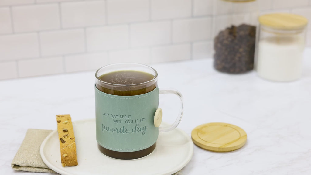 - IN-HOUSE DESIGN: Embrace the warmth of appreciation with this heartwarming drinkware adorned with a charming green wrap. The wrap bears the loving sentiment "Any Day Spent With You Is My Favorite Day," exquisitely engraved, complemented by delicate green stitching, a tan button, and a white elastic closure for a touch of elegance. Meanwhile, the coaster cap crafted from natural wood grain showcases a rounded "Share Kindness" text encircled by a circular line, radiating positivity with every sip.