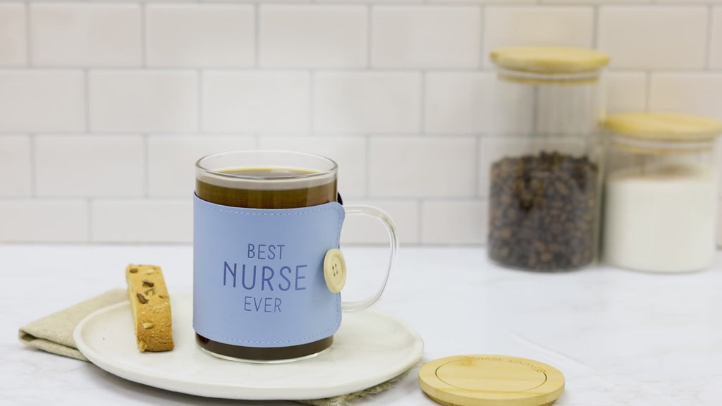 - IN-HOUSE DESIGN: Embrace the warmth of appreciation with this heartwarming drinkware adorned with a charming blue wrap. The wrap bears the loving sentiment "Best Nurse Ever," exquisitely engraved, complemented by delicate blue stitching, a tan button, and a white elastic closure for a touch of elegance. Meanwhile, the coaster cap crafted from natural wood grain showcases a rounded "Share Kindness" text encircled by a circular line, radiating positivity with every sip.