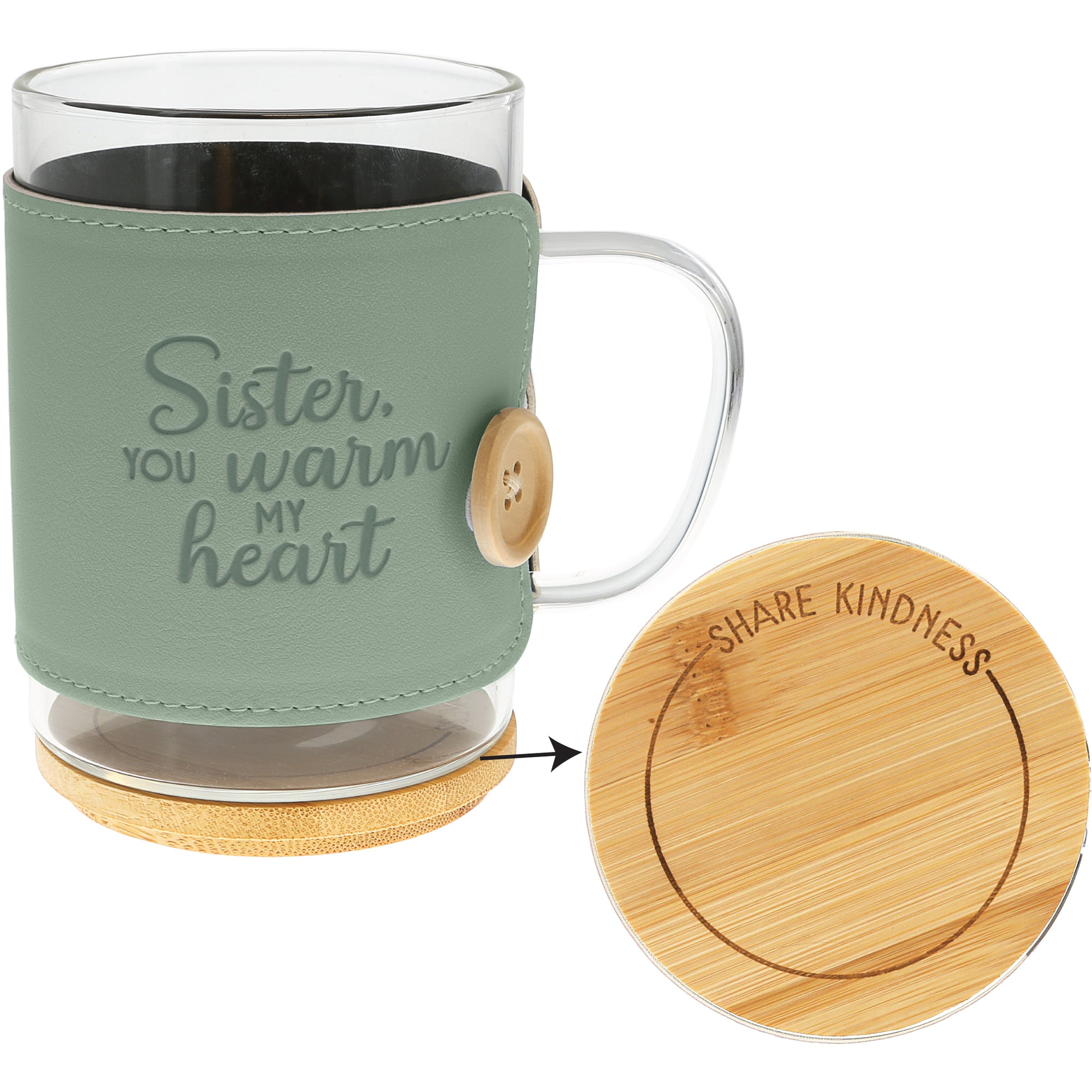 - IN-HOUSE DESIGN: Embrace the warmth of appreciation with this heartwarming drinkware adorned with a charming green wrap. The wrap bears the loving sentiment "Sister, You Warm My Heart," exquisitely engraved, complemented by delicate green stitching, a tan button, and a white elastic closure for a touch of elegance. Meanwhile, the coaster cap crafted from natural wood grain showcases a rounded "Share Kindness" text encircled by a circular line, radiating positivity with every sip.