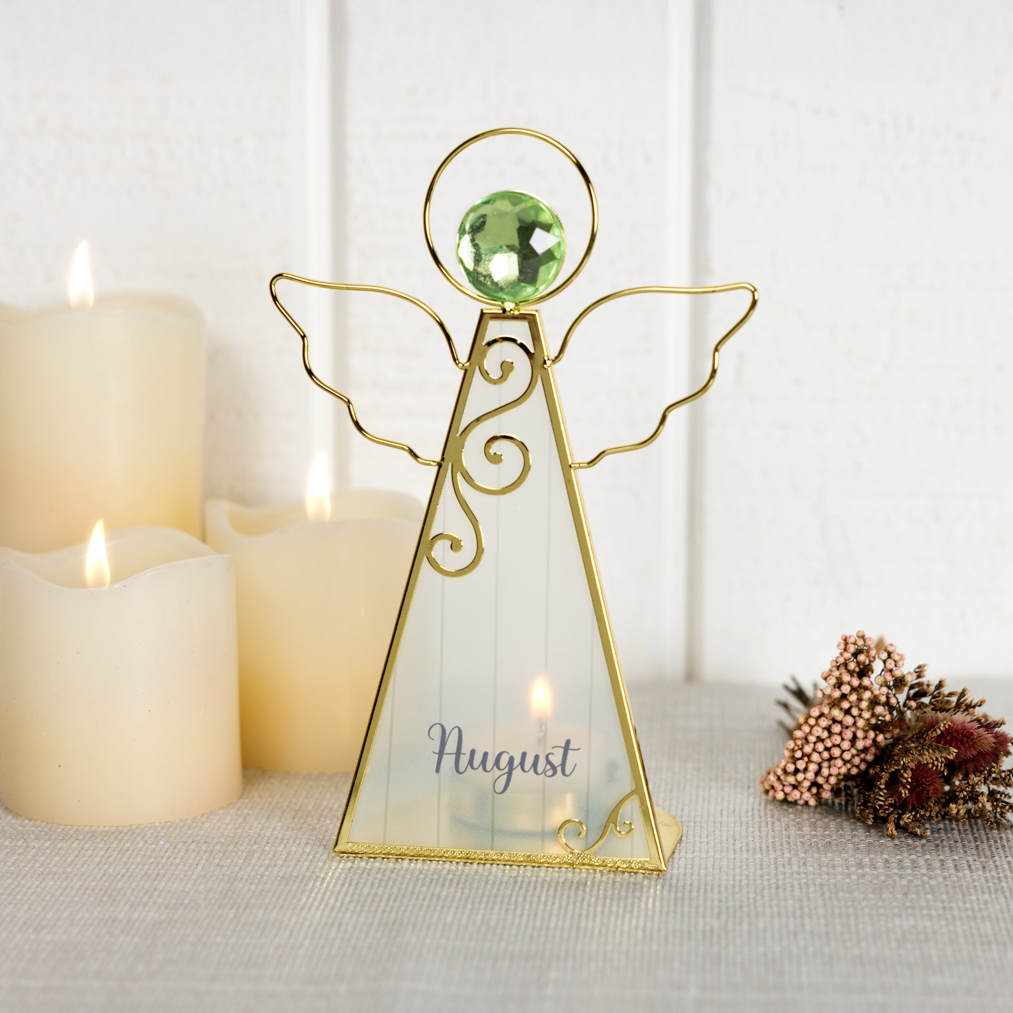 - PREMIUM QUALITY: Crafted from premium materials, this 6.5" angel tealight holder features sturdy metal construction and ribbed glass, adorned with a peridot-colored gem representing August and its zodiac signs (Leo and Virgo). Designed to bring peace and beauty to any environment, it’s perfect for both decorative and functional purposes, adding a serene glow to any room when illuminated.