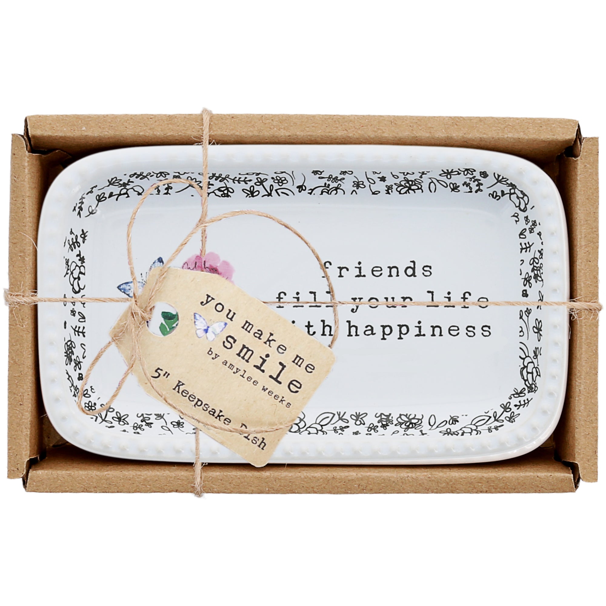 - IN-HOUSE DESIGN: The black floral pattern outlines a pink rose and blue/pink butterfly watercolor image accompanied by a "friends fill your life with happiness" glossy sentiment decal on the front of this shiny white beaded tray—Prop 65 food-safe finish - artwork designed by artist Amylee Weeks who sees the beauty in everyday life.