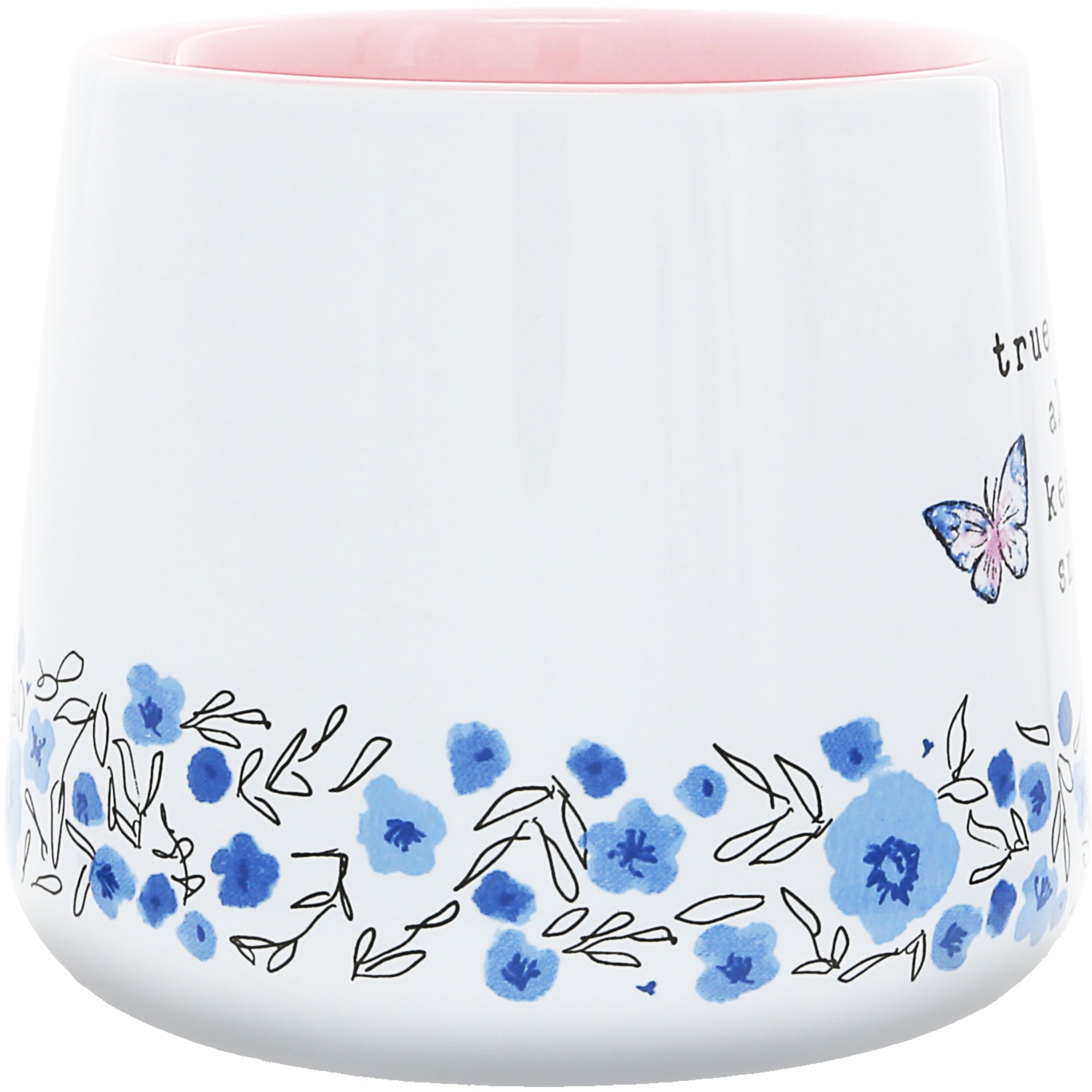 - IN-HOUSE DESIGN: You will see a typewriter with a "True Friends Always Keep You Smiling" sentiment is placed in the top center of the mug. A pink glossy interior smooth-edged vessel with a glossy exterior with walls that features a blue floral design that wraps around the outside bottom third of the cup. Two beautiful butterflies flutter next to the sentiment.
