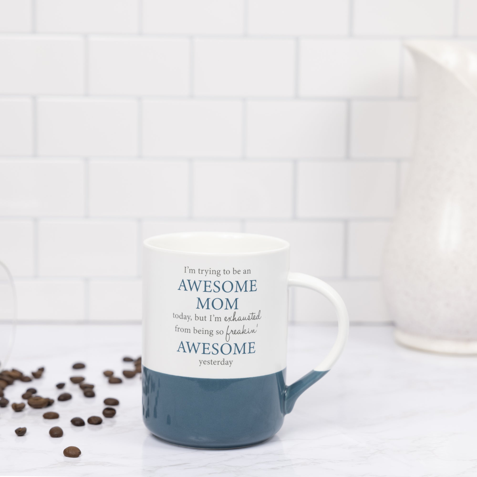 - IN-HOUSE DESIGN: The glossy glaze-dipped bottom is teal blue-green and wraps around the mug, touching the base of the handle. Whereas the remainder, including the interior, is white. The humorous "I'm Trying To Be An Awesome Mom Today, But I'm Exhausted From Being So Freakin' Awesome Yesterday" gray & teal sentiment combines cursive and a simplistic serif font.