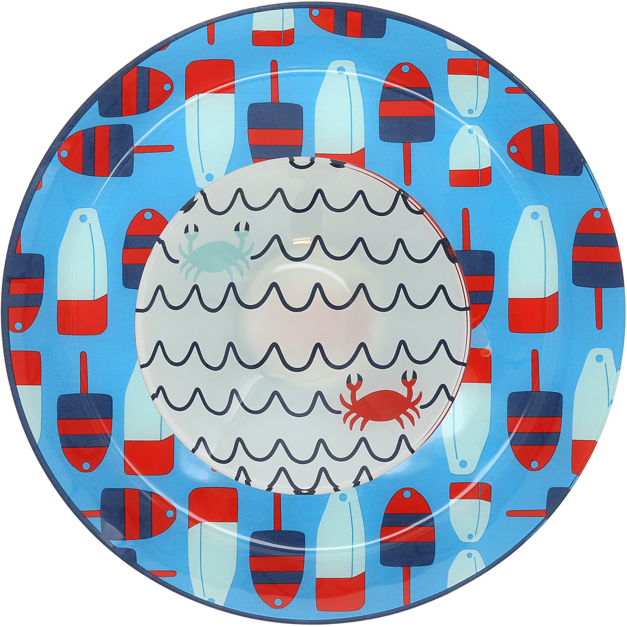 - IN-HOUSE DESIGN: The 6" red lip is accompanied by a white background, blue waves, and a pair of crabs. One is blue and red, both with dark blue pinchers on the bowl. The tray has a blue background and a darker blue rim with red/white/blue boat fenders for docking.