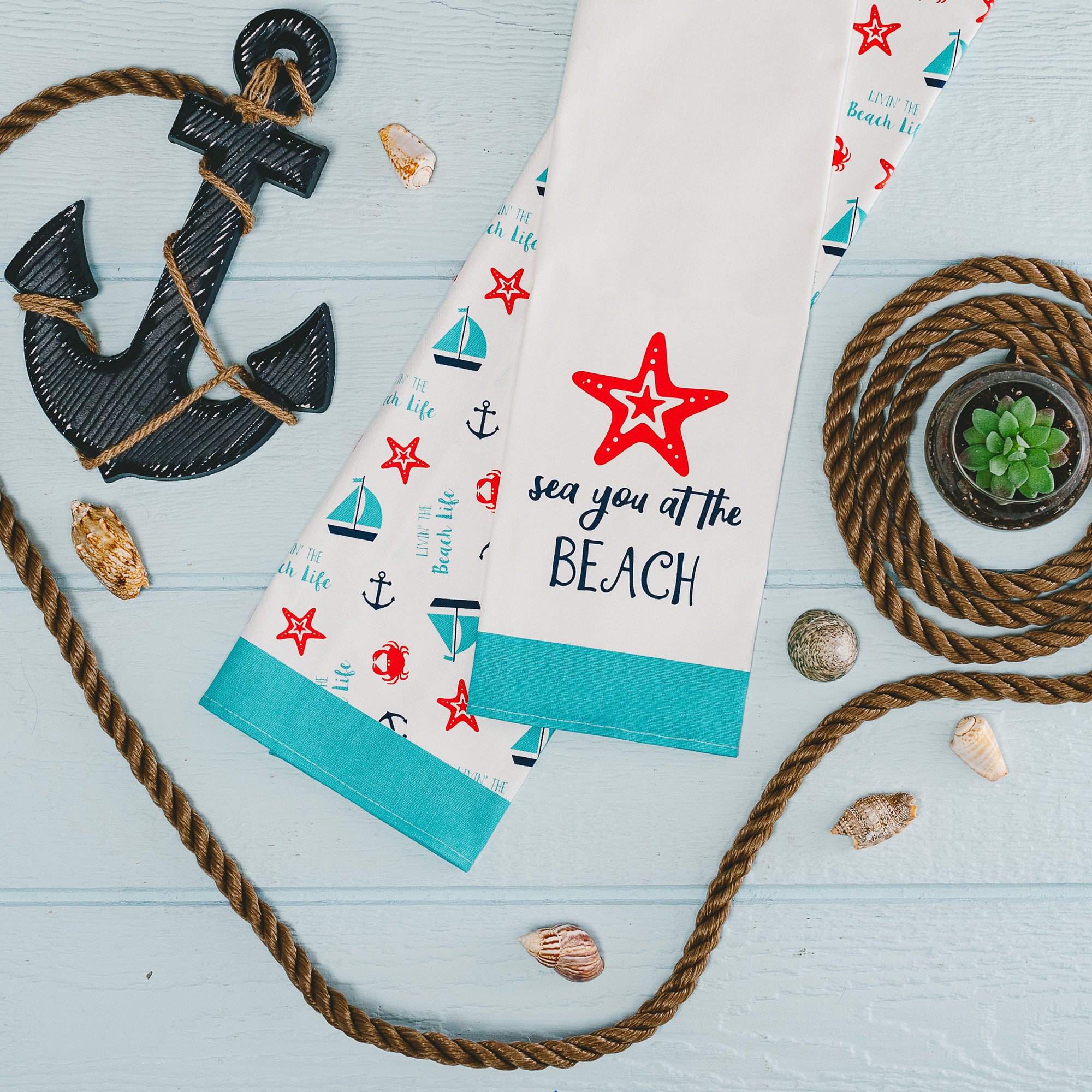 - IN-HOUSE DESIGN: "Sea You At The Beach" text is printed onto the front of one tea towel and a beach-themed pattern, including starfish, anchors, crabs, and boats, is printed onto the other.