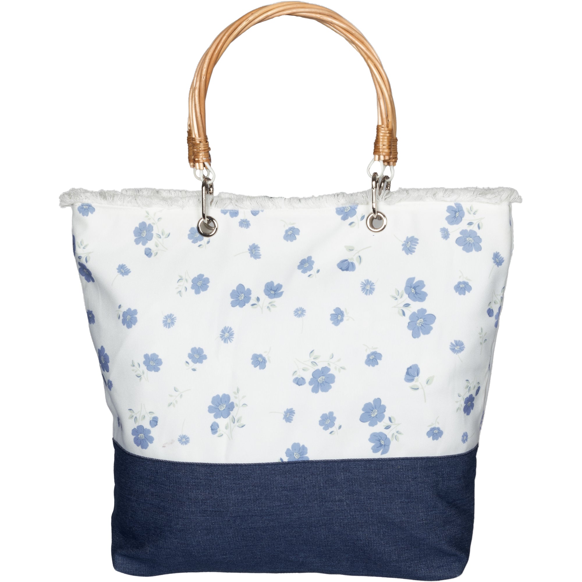 • PREMIUM QUALITY: Designed from durable 100% polyester with a reinforced denim bottom panel, this 15" × 4.75" × 18.5" tote bag is lightweight yet sturdy enough for daily use. Features removable rattan handles with silver hardware and a white band detail for added style. Fully lined interior keeps belongings protected, while the structured base offers dependable strength for errands, books, travel, and more.