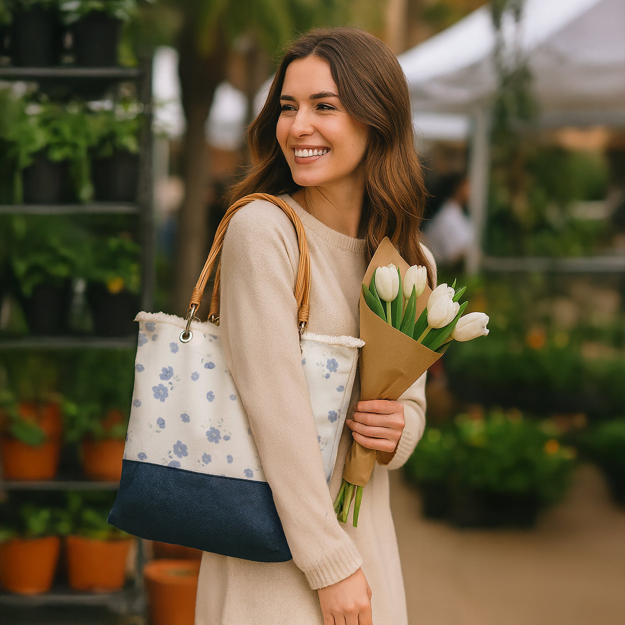 • IN-HOUSE DESIGN: Decorated with soft blue floral artwork that coordinates with the Petals of Love collection. The denim base provides contrast and durability, while the woven rattan handles add a charming boutique-inspired touch. Includes a sewn-in side logo tag and a printed bottom logo for cohesive branding and polished finishing.