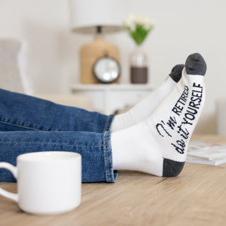 - IN-HOUSE DESIGN: The crew socks have a heathered gray ankle, toe & heel with a white body and a black "I'm Retired Do it Yourself" sentiment on the outer lateral of the boot socks. The top of the crew socks have two stripes.